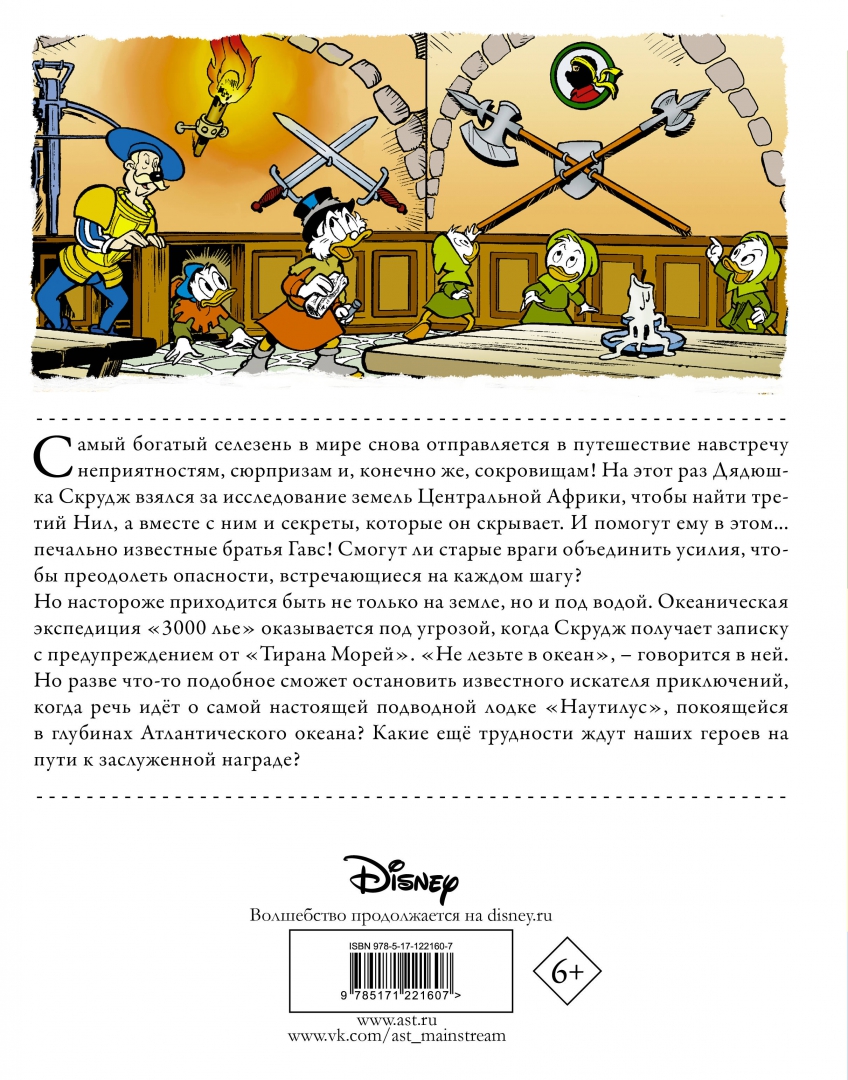 ОписаниеСамый богатый селезень в мире снова отправляется в путешествие навстречу неприятностям, сюрпризам и, конечно же, сокровищам! На этот раз Дядюшка Скрудж взялся за исследование земель Центральной Африки, чтобы найти третий Нил, а вместе с ним и секреты, которые он скрывает. И помогут ему в этом... печально известные братья Гавс! Смогут ли старые враги объединить усилия, чтобы преодолеть опасности, встречающиеся на каждом шагу? Но настороже приходится быть не только на земле, но и под водой. Океаническая экспедиция "3000 лье" оказывается под угрозой, когда Скрудж получает записку с предупреждением от "Тирана Морей". "Не лезьте в океан", - говорится в ней. Но разве что-то подобное сможет остановить известного искателя приключений, когда речь идёт о самой настоящей подводной лодке "Наутилус", покоящейся в глубинах Атлантического океана? Какие ещё трудности ждут наших героев на пути к заслуженной награде?Для среднего и старшего школьного возраста.Самый богатый селезень в мире снова отправляется в путешествие навстречу неприятностям, сюрпризам и, конечно же, сокровищам! На этот раз Дядюшка Скрудж взялся за исследование земель Центральной Африки, чтобы найти третий Нил, а вместе с ним и секреты, которые он скрывает. И помогут ему в этом... печально известные братья Гавс! Смогут ли старые враги объединить усилия, чтобы преодолеть опасности, встречающиеся на каждом шагу? Но настороже приходится быть не только на земле, но и под водой. Океаническая экспедиция "3000 лье" оказывается под угрозой, когда Скрудж получает записку с предупреждением от "Тирана Морей". "Не лезьте в океан", - говорится в ней. Но разве что-то подобное сможет остановить известного искателя приключений, когда речь идёт о самой настоящей подводной лодке "Наутилус", покоящейся в глубинах Атлантического океана? Какие ещё трудности ждут наших героев на пути к заслуженной награде?Для среднего и старшего школьного возраста.