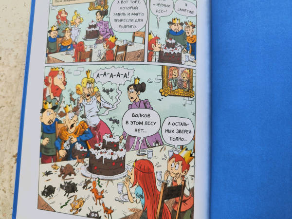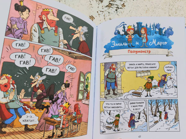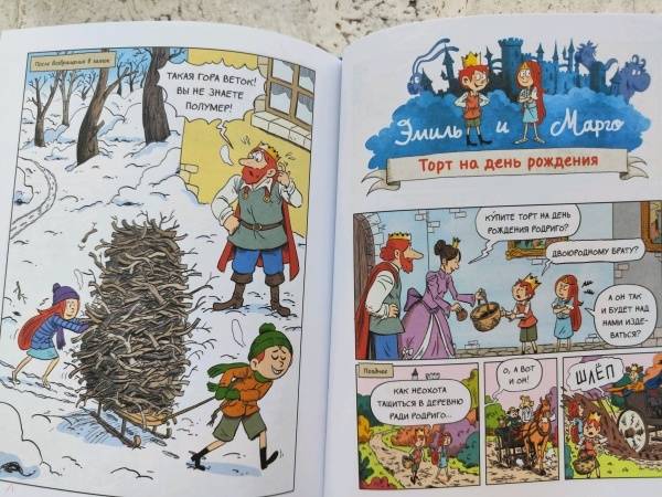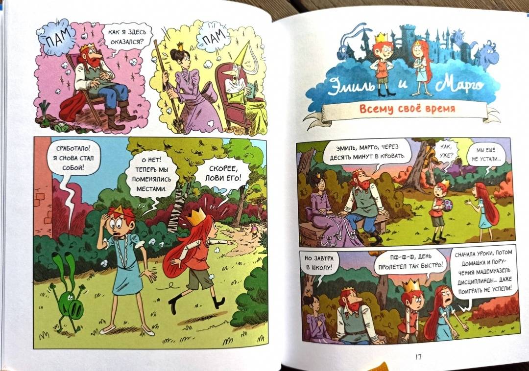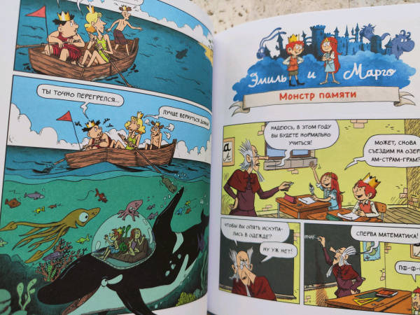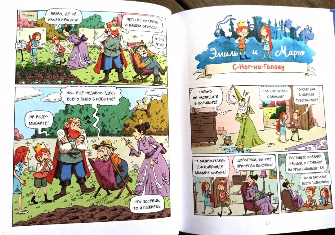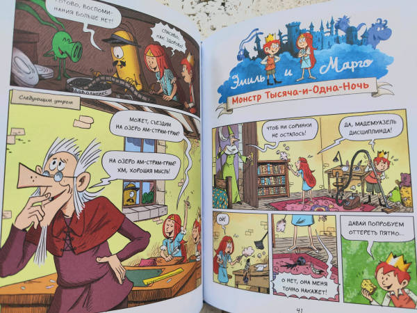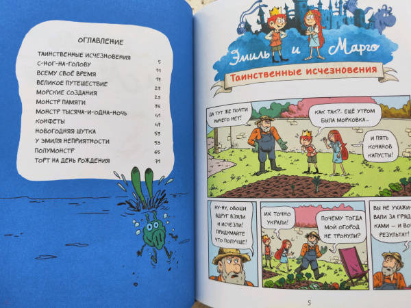 ОписаниеО книгеНовые истории Эмиля и Марго - в замке и не только!Эмиля и Марго ждут приключения. Они найдут пару Полумонстру, гуляя в заснеженном в парке, поедут на море в гигантском Улиткодоме и отправятся под землю спасать свой урожай.Вот только времени, чтобы успеть как следует повеселиться, порой не хватает... Хорошо, что монстры тут как тут и помогут продлить вечер на несколько часов. Правда, каждый раз, когда кажется, что всё наконец-то идет как надо, принца, принцессу и их необычных друзей ждет невероятный поворот.О серииЭмиль и Марго - озорные принц и принцесса. Как и все дети, они болеют, дурачатся, не очень-то любят учить уроки и заниматься уборкой. Эмиль и Марго живут в замке рядом с лесом, населенным монстриками. С такими соседями не соскучишься - принц и принцесса постоянно попадают во всякие переделки с этими монстриками, сводя с ума присматривающую за ними мадам Дисциплинду.Фишки книги- Волшебный мир, населенный забавными монстриками - не страшными, а добрыми и дружелюбными.- Яркие герои, которые будут близки детям.- Веселые, добрые истории о повседневных делах с примесью волшебства.- Описанные ситуации знакомы каждому ребенку: принц и принцесса убираются в комнате, болеют, ходят в школу и никогда не забывают озорничать.- Короткие рассказы (в каждой главе - всего 6 страниц) идеально подойдут для маленьких читателей: перед сном можно прочитать 2-3 истории и спокойно засыпать.- Знакомство с серией вы можете начать с любого тома, книги не связаны единым сюжетом.- Поможет ребенку начать читать самостоятельно.Для кого эта книгаДля детей от 5 лет и их родителей.Для тех, кому полюбились озорные приключения принца Эмиля и принцессы Марго.Для всей семьи, если вы любите читать и веселиться вместе.Для всех любителей комиксов.Для младшего школьного возраста.СвернутьО книгеНовые истории Эмиля и Марго - в замке и не только!Эмиля и Марго ждут приключения. Они найдут пару Полумонстру, гуляя в заснеженном в парке, поедут на море в гигантском Улиткодоме и отправятся под землю спасать свой урожай.Вот только времени, чтобы успеть как следует повеселиться, порой не хватает... Хорошо, что монстры тут как тут и помогут продлить вечер на несколько часов. Правда, каждый раз, когда кажется, что всё наконец-то идет как надо, принца, принцессу и их необычных друзей ждет невероятный поворот.О серииЭмиль и Марго - озорные принц и принцесса. Как и все дети, они болеют, дурачатся, не очень-то любят учить уроки и заниматься уборкой. Эмиль и Марго живут в замке рядом с лесом, населенным монстриками. С такими соседями не соскучишься - принц и принцесса постоянно попадают во всякие переделки с этими монстриками, сводя с ума присматривающую за ними мадам Дисциплинду.Фишки книги- Волшебный мир, населенный забавными монстриками - не страшными, а добрыми и дружелюбными.- Яркие герои, которые будут близки детям.- Веселые, добрые истории о повседневных делах с примесью волшебства.- Описанные ситуации знакомы каждому ребенку: принц и принцесса убираются в комнате, болеют, ходят в школу и никогда не забывают озорничать.- Короткие рассказы (в каждой главе - всего 6 страниц) идеально подойдут для маленьких читателей: перед сном можно прочитать 2-3 истории и спокойно засыпать.- Знакомство с серией вы можете начать с любого тома, книги не связаны единым сюжетом.- Поможет ребенку начат