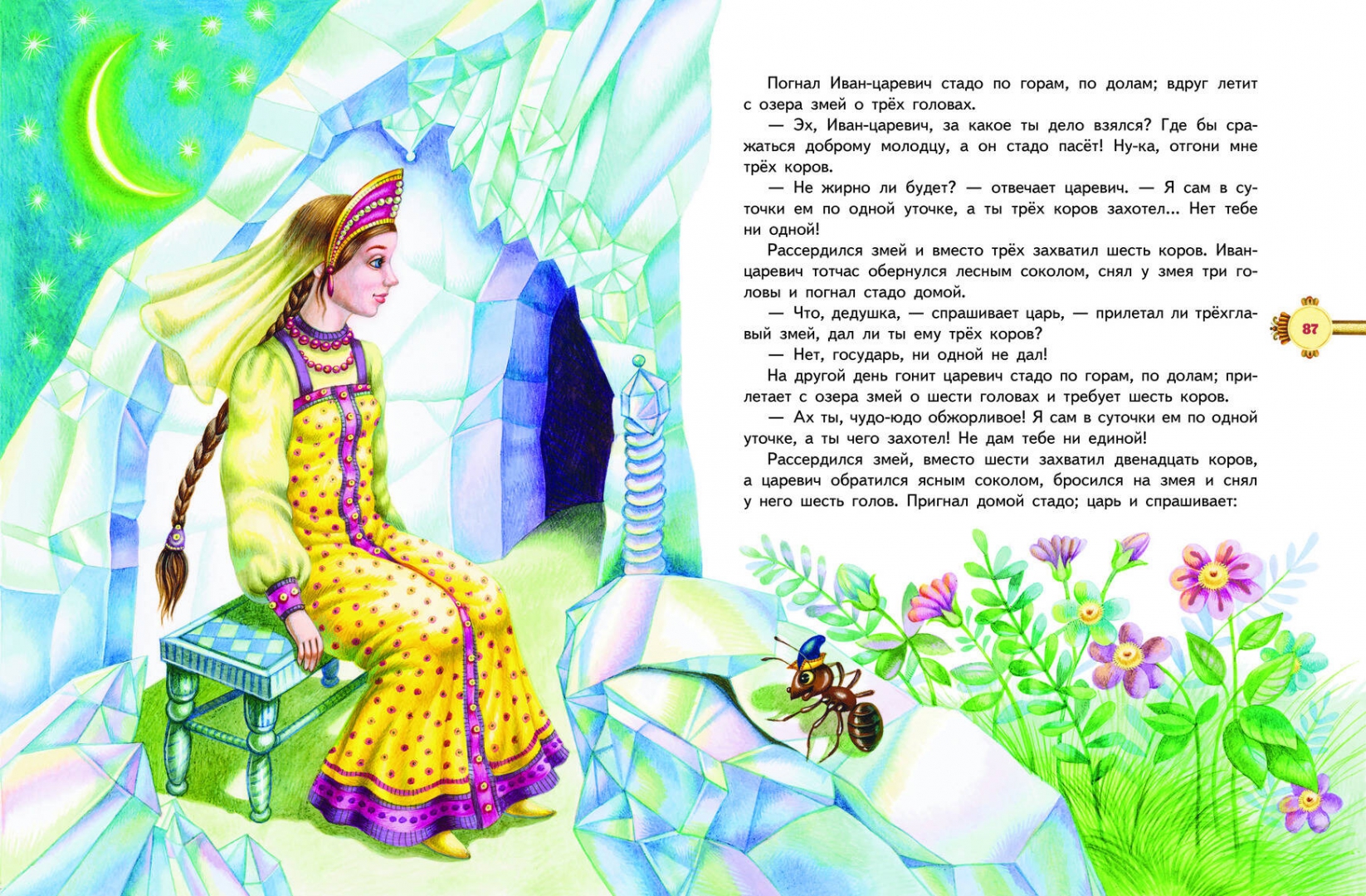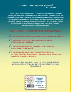 ОписаниеВ книге собрано 8 известных русских волшебных сказок: "Несмеяна-царевна", "Никита Кожемяка", "Царевна-лягушка" и другие. Драконы, превращения и говорящие животные создадут вокруг ребёнка сказочную атмосферу, проверенные временем тексты познакомят его с лучшими произведениями русского народного творчества, а красочные иллюстрации Марины Литвиновой, которые встречаются на каждом развороте, ярко передадут историю и дух русской культуры. Мечта всех родителей - подружить ребёнка с книгой. Ведь книги дарят маленькому читателю целый мир: заинтересовывают, развлекают, заставляют задуматься. Всеми этими качествами обладают книги серии "Моя первая библиотека". И они наверняка понравятся начинающим читателям с первого взгляда! Под яркими обложками, сияющими золотой фольгой, скрываются настоящие сокровища! Это сказки, басни, стихи, рассказы и повести, которые составляют "золотой фонд" детской классической литературы. Множество ярких, добрых и подробных иллюстраций, крупный, удобный для чтения шрифт и, конечно, увлекательные истории сделают дружбу юного читателя с книгами по-настоящему долгой и крепкой!СвернутьВ книге собрано 8 известных русских волшебных сказок: "Несмеяна-царевна", "Никита Кожемяка", "Царевна-лягушка" и другие. Драконы, превращения и говорящие животные создадут вокруг ребёнка сказочную атмосферу, проверенные временем тексты познакомят его с лучшими произведениями русского народного творчества, а красочные иллюстрации Марины Литвиновой, которые встречаются на каждом развороте, ярко передадут историю и дух русской культуры. Мечта всех родителей - подружить ребёнка с книгой. Ведь книги дарят маленькому читателю целый мир: заинтересовывают, развлекают, заставляют задуматься. Всеми этими качествами обладают книги серии "Моя первая библиотека". И они наверняка понравятся начинающим читателям с первого взгляда! Под яркими обложками, сияющими золотой фольгой, скрываются настоящие сокровища! Это сказки, басни, стихи, рассказы и повести, которые составляют "золотой фонд" детской классической литературы. Множество ярких, добрых и подробных иллюстраций, крупный, удобный для чтения шрифт и, конечно, увлекательные истории сделают дружбу юного читателя с книгами по-настоящему долгой и крепкой!СвернутьСвернуть