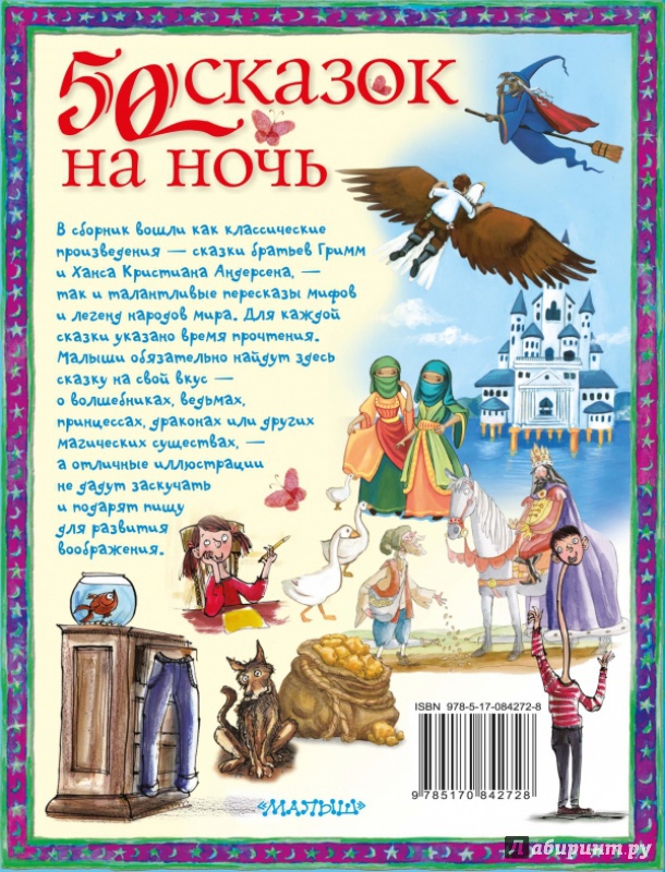 ОписаниеЗамечательно иллюстрированное издание включает 50 небольших сказок, скомпонованных в шесть разделов. В сборник вошли как классические произведения - сказки братьев Гримм и Ханса Кристиана Андерсена, - так и талантливые пересказы мифов и легенд народов мира. Для каждой сказки указано время прочтения, чтобы мама, папа или бабушка могли решить, успеют ли они добраться до конца истории, прежде чем ребенок заснет. Каждый малыш обязательно найдет здесь сказку на свой вкус - о волшебниках, ведьмах, принцессах, драконах или других магических существах, - а отличные иллюстрации не дадут ему заскучать и подарят пищу для развития воображения.Для детей дошкольного и младшего школьного возраста.Замечательно иллюстрированное издание включает 50 небольших сказок, скомпонованных в шесть разделов. В сборник вошли как классические произведения - сказки братьев Гримм и Ханса Кристиана Андерсена, - так и талантливые пересказы мифов и легенд народов мира. Для каждой сказки указано время прочтения, чтобы мама, папа или бабушка могли решить, успеют ли они добраться до конца истории, прежде чем ребенок заснет. Каждый малыш обязательно найдет здесь сказку на свой вкус - о волшебниках, ведьмах, принцессах, драконах или других магических существах, - а отличные иллюстрации не дадут ему заскучать и подарят пищу для развития воображения.Для детей дошкольного и младшего школьного возраста.