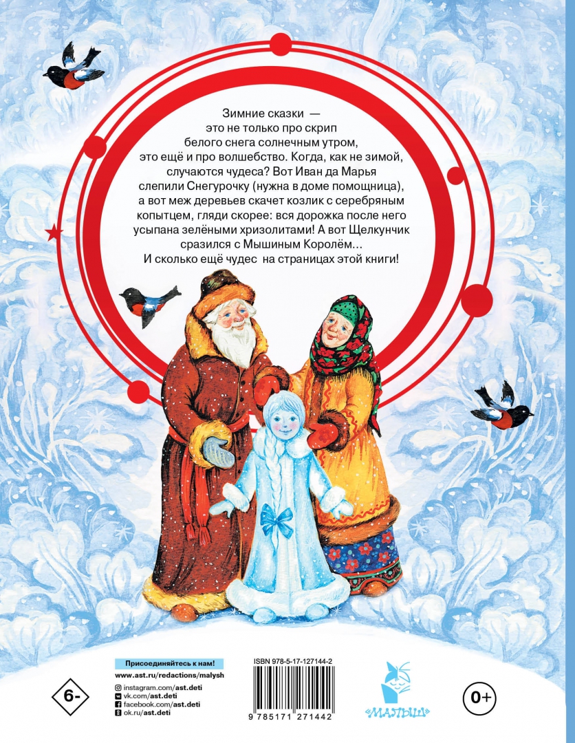 ОписаниеВ книге "Снегурочка. Зимние сказки" собраны произведения, без которых не обходится ни одна подготовка к волшебному празднику Новому году. Читатель познакомится с зимними сюжетами русских народных сказок ("Морозко", "Снегурочка", "Про Емелю, или По щучьему веленью") в пересказе Л. Елисеевой; побывает в гостях у бабушки Вьюги и заглянет на ёлку, где уже начали раздавать подарки, среди которых бравый солдат Щелкунчик.Сюжеты к зимним сказкам нарисовали талантливые художники Л. Владимирский, Э. Булатов и О. Васильев, Т. Морковкина и другие.Для детей до 3-х лет.В книге "Снегурочка. Зимние сказки" собраны произведения, без которых не обходится ни одна подготовка к волшебному празднику Новому году. Читатель познакомится с зимними сюжетами русских народных сказок ("Морозко", "Снегурочка", "Про Емелю, или По щучьему веленью") в пересказе Л. Елисеевой; побывает в гостях у бабушки Вьюги и заглянет на ёлку, где уже начали раздавать подарки, среди которых бравый солдат Щелкунчик.Сюжеты к зимним сказкам нарисовали талантливые художники Л. Владимирский, Э. Булатов и О. Васильев, Т. Морковкина и другие.Для детей до 3-х лет.