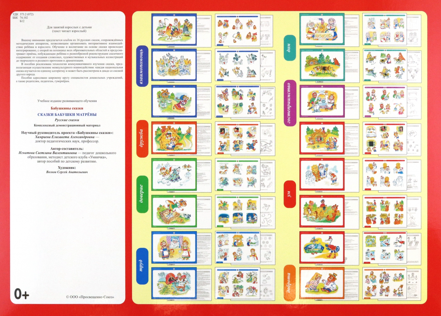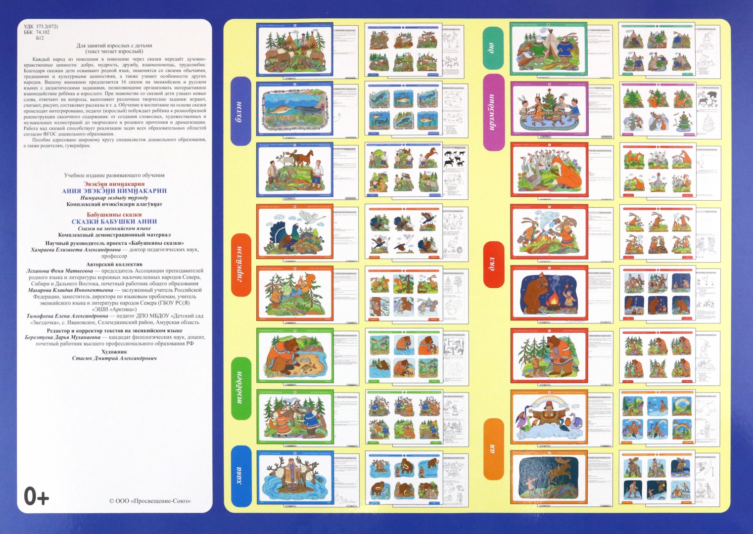 ОписаниеКомплексный демонстрационный материал "Бабушкины сказки" включает в себя два взаимосвязанных альбома, состоящих из 16 сказок на эвенкийском языке и 16 русских сказок.Сказки объединены едиными концептами, такими как взаимопомощь, дружба, доверие, труд, дом, гостеприимство, ум, доброта.Материалы альбома предполагают использование дидактических материалов и системы развивающих занятий для детей дошкольного возраста в концепции диалога родной эвенкийской и русской культур, что обеспечивает единство образовательного и воспитательного пространства в Российской Федерации.Пособие адресовано широкому кругу специалистов дошкольных учреждений, а также родителям, педагогам, гувернёрам.Комплексный демонстрационный материал "Бабушкины сказки" включает в себя два взаимосвязанных альбома, состоящих из 16 сказок на эвенкийском языке и 16 русских сказок.Сказки объединены едиными концептами, такими как взаимопомощь, дружба, доверие, труд, дом, гостеприимство, ум, доброта.Материалы альбома предполагают использование дидактических материалов и системы развивающих занятий для детей дошкольного возраста в концепции диалога родной эвенкийской и русской культур, что обеспечивает единство образовательного и воспитательного пространства в Российской Федерации.Пособие адресовано широкому кругу специалистов дошкольных учреждений, а также родителям, педагогам, гувернёрам.