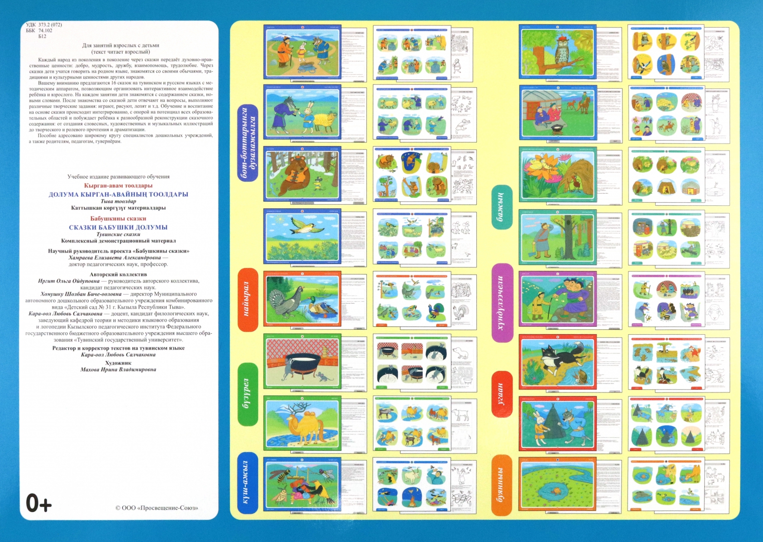 ОписаниеКомплексный демонстрационный материал "Бабушкины сказки" включает в себя два взаимосвязанных альбома, состоящих из 16 тувинских и 16 русских сказок.Сказки объединены едиными концептами, такими как взаимопомощь, дружба, доверие, труд, дом, гостеприимство, ум, доброта.Материалы альбома предполагают использование дидактических материалов и системы развивающих занятий для детей дошкольного возраста в концепции диалога родной тувинской и русской культур, что обеспечивает единство образовательного и воспитательного пространства в Российской Федерации.Пособие адресовано широкому кругу специалистов дошкольных учреждений, а также родителям, педагогам, гувернёрам.Комплексный демонстрационный материал "Бабушкины сказки" включает в себя два взаимосвязанных альбома, состоящих из 16 тувинских и 16 русских сказок.Сказки объединены едиными концептами, такими как взаимопомощь, дружба, доверие, труд, дом, гостеприимство, ум, доброта.Материалы альбома предполагают использование дидактических материалов и системы развивающих занятий для детей дошкольного возраста в концепции диалога родной тувинской и русской культур, что обеспечивает единство образовательного и воспитательного пространства в Российской Федерации.Пособие адресовано широкому кругу специалистов дошкольных учреждений, а также родителям, педагогам, гувернёрам.