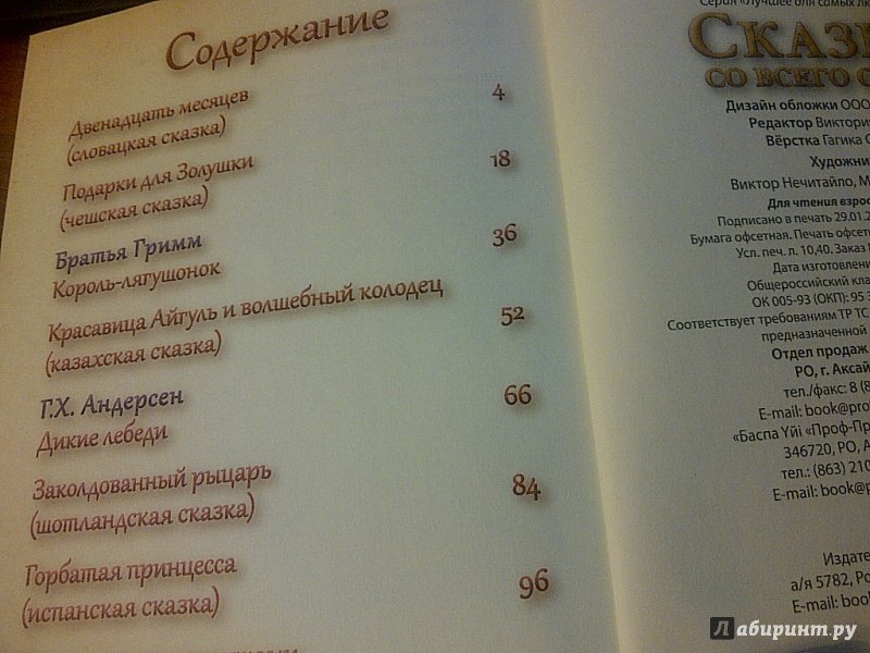 ОписаниеСовершить увлекательное путешествие в мир сказок и познакомиться с народным творчеством, собранным с разных концов света вам поможет книга "Сказки со всего света". В ней вы найдете словацкую, чешскую, казахскую, шотландскую, испанскую и болгарскую сказки, которые позволят вам окунуться в совершенно различные культуры, быт, традиции и познакомят вас с национальными героями. Наряду с этим в сборник включены и две авторские сказки: "Король-лягушонок" братьев Гримм и "Дикие лебеди" Ганса Христиана Андерсена. Вместе со сказочными персонажами вас ждут загадочные приключения и чудеса. Осталось только выбрать сказку и... отправиться в путь по всему миру!Для чтения взрослыми детям.Совершить увлекательное путешествие в мир сказок и познакомиться с народным творчеством, собранным с разных концов света вам поможет книга "Сказки со всего света". В ней вы найдете словацкую, чешскую, казахскую, шотландскую, испанскую и болгарскую сказки, которые позволят вам окунуться в совершенно различные культуры, быт, традиции и познакомят вас с национальными героями. Наряду с этим в сборник включены и две авторские сказки: "Король-лягушонок" братьев Гримм и "Дикие лебеди" Ганса Христиана Андерсена. Вместе со сказочными персонажами вас ждут загадочные приключения и чудеса. Осталось только выбрать сказку и... отправиться в путь по всему миру!Для чтения взрослыми детям.