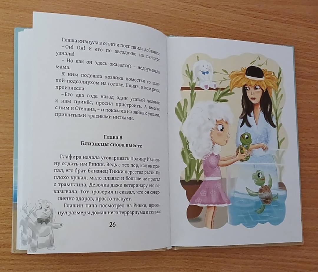 ОписаниеУ девочки Глафиры появляются два забавных морских черепашонка - близнецы Рикки и Тикки. Сами того не желая, красноухие питомцы оказываются вдали от родного дома. Во время опасных приключений они познают окружающий мир и обретают настоящих друзей. Верными спутниками братьев становятся плюшевый заяц Степан и одинокий дедушка Никодимыч.Вернутся ли Рикки и Тикки к своей маленькой хозяйке Глафире, когда она их отыщет в деревне Хорошовке? Об этом вы узнаете, преодолев с героями повести-сказки приключенческий путь до конца.Для дошкольного и младшего школьного возраста.У девочки Глафиры появляются два забавных морских черепашонка - близнецы Рикки и Тикки. Сами того не желая, красноухие питомцы оказываются вдали от родного дома. Во время опасных приключений они познают окружающий мир и обретают настоящих друзей. Верными спутниками братьев становятся плюшевый заяц Степан и одинокий дедушка Никодимыч.Вернутся ли Рикки и Тикки к своей маленькой хозяйке Глафире, когда она их отыщет в деревне Хорошовке? Об этом вы узнаете, преодолев с героями повести-сказки приключенческий путь до конца.Для дошкольного и младшего школьного возраста.