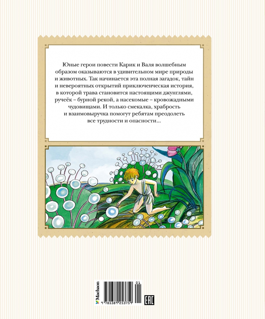 ОписаниеЮные герои повести Карик и Валя волшебным образом оказываются в удивительном мире природы и животных. Так начинается эта полная загадок, тайн и невероятных открытий приключенческая история, в которой трава оказывается настоящими джунглями, ручеёк – бурной рекой, а насекомые – кровожадными чудовищами. И только смекалка, храбрость и взаимовыручка помогут ребятам преодолеть все трудности и опасности…Юные герои повести Карик и Валя волшебным образом оказываются в удивительном мире природы и животных. Так начинается эта полная загадок, тайн и невероятных открытий приключенческая история, в которой трава оказывается настоящими джунглями, ручеёк – бурной рекой, а насекомые – кровожадными чудовищами. И только смекалка, храбрость и взаимовыручка помогут ребятам преодолеть все трудности и опасности…