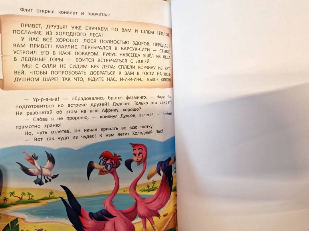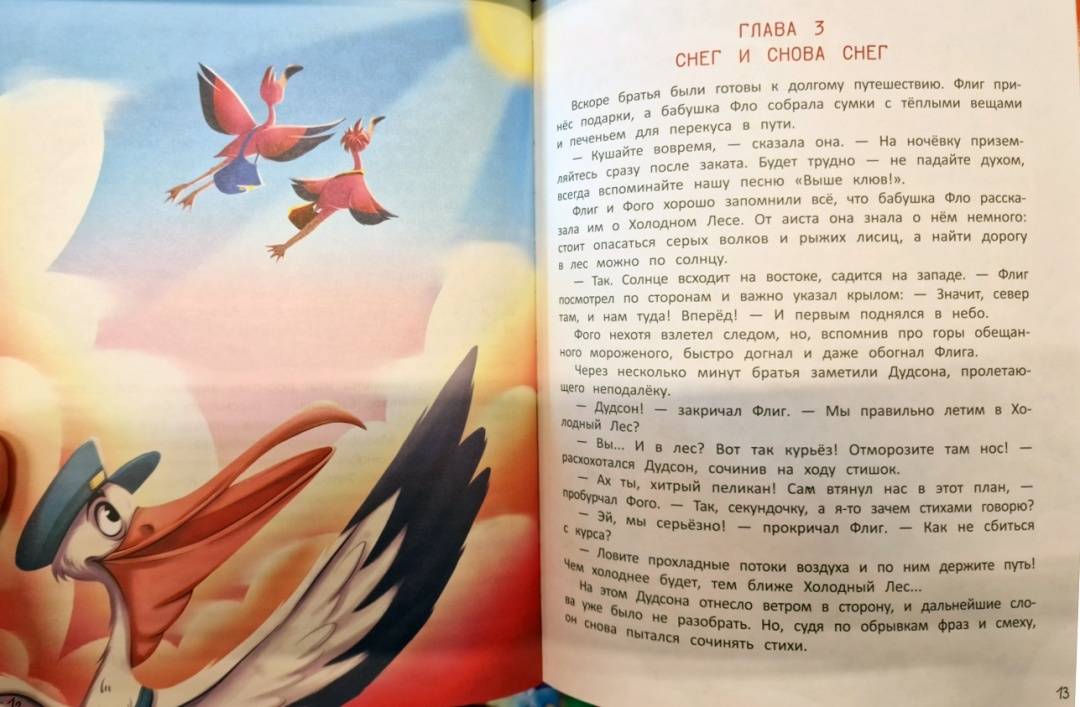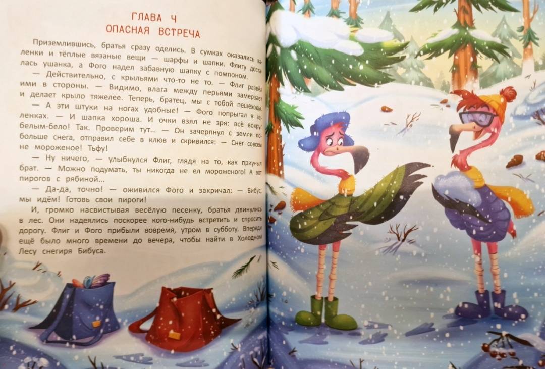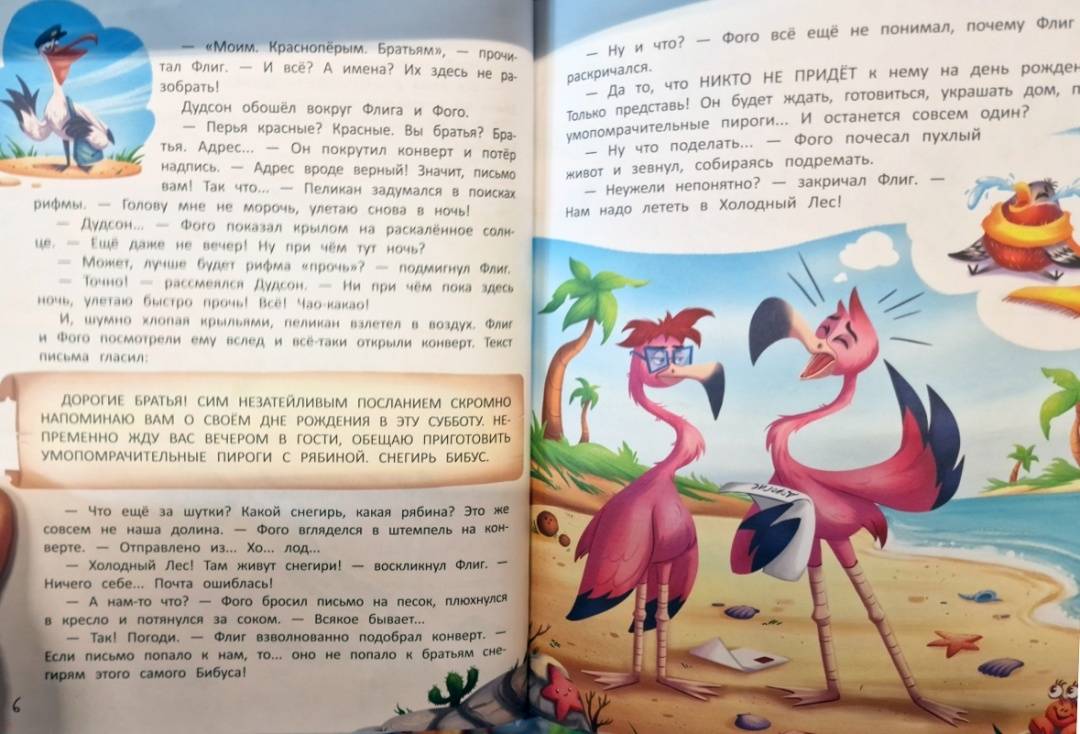 ОписаниеСкучая под африканским солнышком и потягивая ананасовый сок, двое братьев фламинго - Флиг и Фого - неожиданно получают из Холодного Леса письмо. В нём снегирь Бибус приглашает своих братьев на день рождения. Фого хочет выбросить письмо, ведь оно попало к ним не по адресу, а Флиг волнуется, что Бибус останется совсем один в свой праздник. Посоветовавшись с бабушкой, Флиг и Фого решают лететь к имениннику! Но на пути к Бибусу братьев ждёт немало приключений... Главное - не отступать перед трудностями и держать клюв по ветру!А если кажется, что выхода совсем нет, - не отчаивайся, пой вместе с братьями песню: "Выше клюв, и вмиг дела пойдут на лад! Выше клюв, и будет жизнь как шоколад! Лишь повторяй: я оптимист! Лишь повторяй: я жизнелюб! И выше клюв, выше клюв, выше клюв!" Тогда решение обязательно найдётся!Скучая под африканским солнышком и потягивая ананасовый сок, двое братьев фламинго - Флиг и Фого - неожиданно получают из Холодного Леса письмо. В нём снегирь Бибус приглашает своих братьев на день рождения. Фого хочет выбросить письмо, ведь оно попало к ним не по адресу, а Флиг волнуется, что Бибус останется совсем один в свой праздник. Посоветовавшись с бабушкой, Флиг и Фого решают лететь к имениннику! Но на пути к Бибусу братьев ждёт немало приключений... Главное - не отступать перед трудностями и держать клюв по ветру!А если кажется, что выхода совсем нет, - не отчаивайся, пой вместе с братьями песню: "Выше клюв, и вмиг дела пойдут на лад! Выше клюв, и будет жизнь как шоколад! Лишь повторяй: я оптимист! Лишь повторяй: я жизнелюб! И выше клюв, выше клюв, выше клюв!" Тогда решение обязательно найдётся!