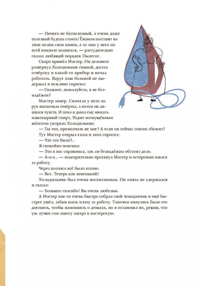 ОписаниеКак помириться с обиженной Лампой и развеселить загрустивший Зонтик? О чём Тапочки болтают с Сапогами, зависший Компьютер — с ехидной Вороной, а Серый Носок — с Клетчатым? Почему Пылесос мечтает попасть в цирк, а Холодильник дружит с котом?Правду знает только писатель Ёжиков. А если не знает — то сочинит про это историю, и она тут же станет правдой. Ни одна из его историй не похожа на другую — и только скучных среди них нет.Книга о писателе Ёжикове и его домочадцах в 2022 году принесла известной липецкой поэтессе и писательнице Галине Соболевой (1961–2024) победу в «Большой сказке», а в 2023-м — премию Правительства Москвы имени Корнея Чуковского.Как помириться с обиженной Лампой и развеселить загрустивший Зонтик? О чём Тапочки болтают с Сапогами, зависший Компьютер — с ехидной Вороной, а Серый Носок — с Клетчатым? Почему Пылесос мечтает попасть в цирк, а Холодильник дружит с котом?Правду знает только писатель Ёжиков. А если не знает — то сочинит про это историю, и она тут же станет правдой. Ни одна из его историй не похожа на другую — и только скучных среди них нет.Книга о писателе Ёжикове и его домочадцах в 2022 году принесла известной липецкой поэтессе и писательнице Галине Соболевой (1961–2024) победу в «Большой сказке», а в 2023-м — премию Правительства Москвы имени Корнея Чуковского.