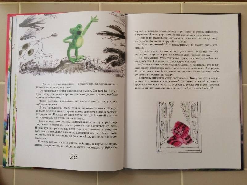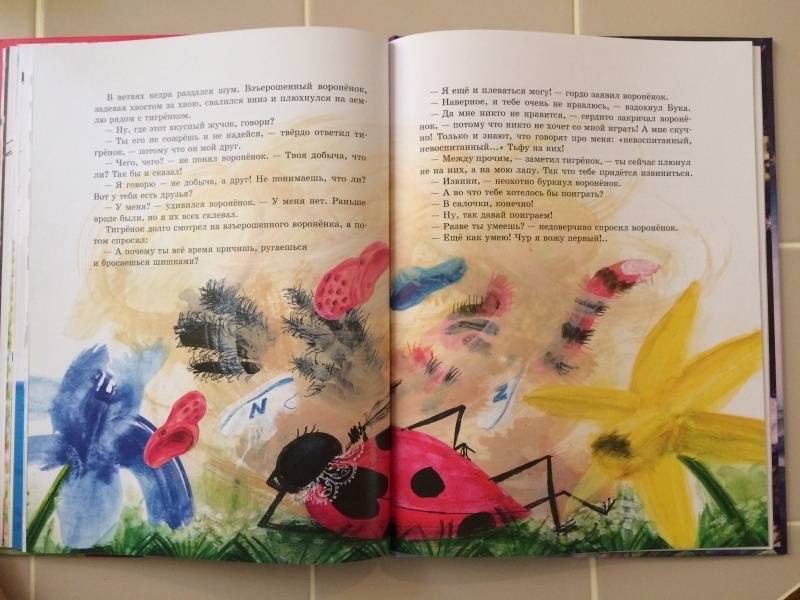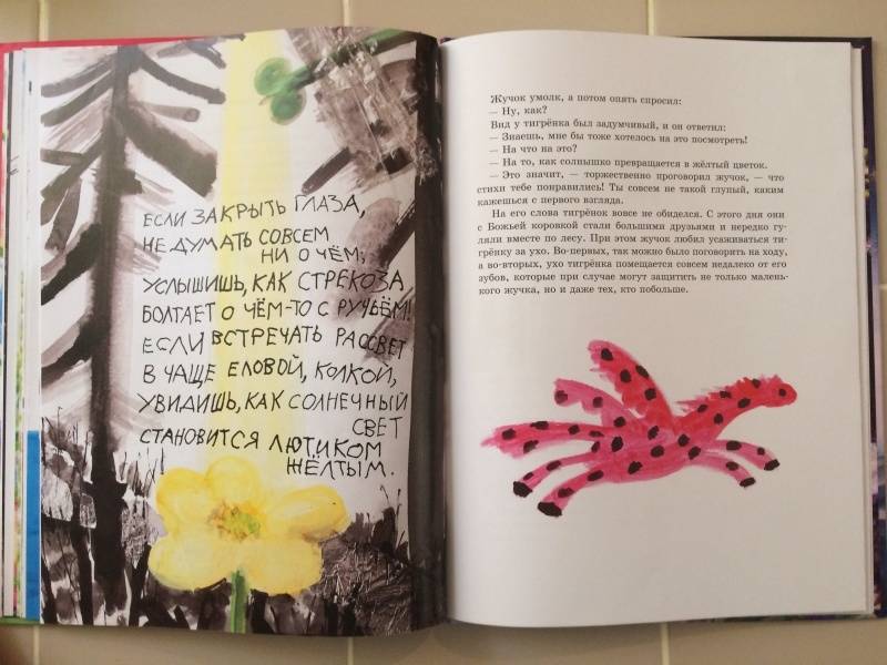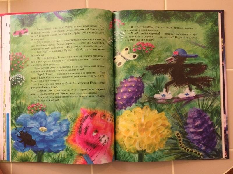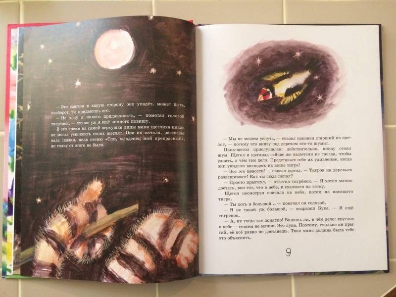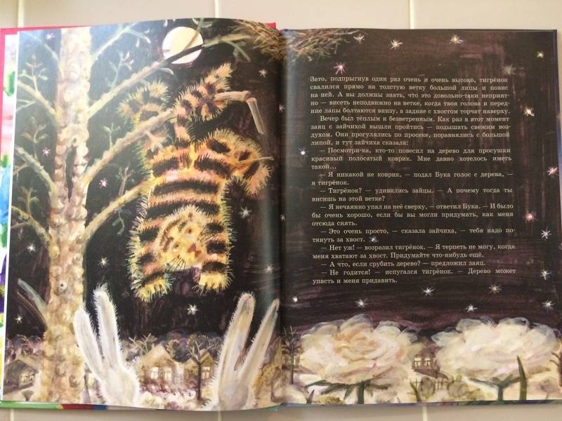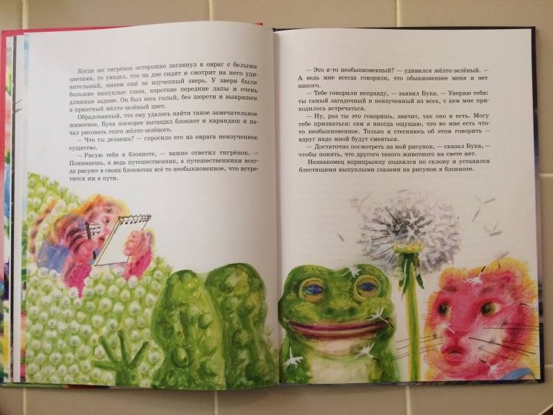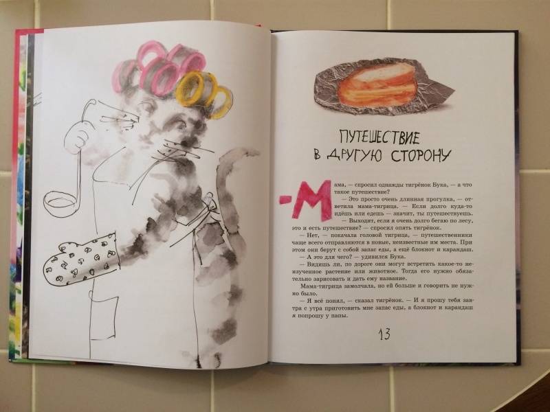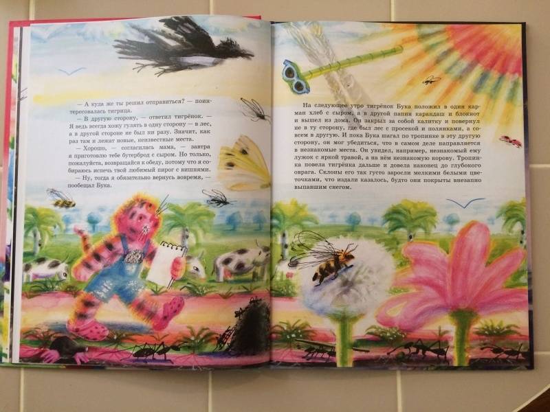 ОписаниеВеселые истории о тигренке по имени Бука придумала писательница Галина Корнилова для своей четырехлетней внучки. Тася обожала животных, но больше всех ей нравились тигры. Эти полосатые звери настолько захватили воображение девочки, что она и себя стала называть тигренком. И имя тигренку дала - Бука. А еще Тася летом жила в деревне и очень любила, когда бабушка рассказывала ей разные истории. Любознательный тигренок отправляется гулять "в другую сторону", чтобы открыть незнакомые места. На пути ему встречаются никому не известный лупоглазый прыгучий зверь, красный жучок с черными точками, невоспитанный вороненок. Он пытается допрыгнуть до луны, учится плавать, становится мостиком через ручей, находит друзей и летает во сне, потому что растет.Все в этой авторской книге подчинено творческому замыслу писателя и художника. Писательница Галина Корнилова дала жизнь симпатичному герою, который играет, мечтает, задает вопросы и ищет на них ответы. Он смотрит на мир широко распахнутыми глазами, ему все интересно. И этим он близок всем детям: истории, которые с ним случаются, близки и понятны каждому ребенку. Художница Екатерина Корнилова создала образ тигренка и тот чудесный мир, который так его удивляет. Чтобы придать этому миру объем и достоверность, Екатерина работала в смешанной технике. Почему облака из сна Буки выглядят такими пушистыми? А потому что они из ваты. Почему крылышки у пчелы и стрекозы такие прозрачные? Потому что они из прозрачной пленки. Почему серебристый ручей бежит как живой? Да просто вода в ручье выложена из фольги. Почему ключик в заводной машинке Буки выглядит как настоящий? А потому что и он сделан из фольги. Живые и яркие иллюстрации пробудят воображение ребенка и его творческие способности. Неудивительно, если малыш так полюбит Буку и его друзей, что тоже захочет взяться за карандаш, кисть и краски, решит самостоятельно сделать аппликацию или слепить героев из пластилина.Для дошкольного возраста.СвернутьВеселые истории о тигренке по имени Бука придумала писательница Галина Корнилова для своей четырехлетней внучки. Тася обожала животных, но больше всех ей нравились тигры. Эти полосатые звери настолько захватили воображение девочки, что она и себя стала называть тигренком. И имя тигренку дала - Бука. А еще Тася летом жила в деревне и очень любила, когда бабушка рассказывала ей разные истории. Любознательный тигренок отправляется гулять "в другую сторону", чтобы открыть незнакомые места. На пути ему встречаются никому не известный лупоглазый прыгучий зверь, красный жучок с черными точками, невоспитанный вороненок. Он пытается допрыгнуть до луны, учится плавать, становится мостиком через ручей, находит друзей и летает во сне, потому что растет.Все в этой авторской книге подчинено творческому замыслу писателя и художника. Писательница Галина Корнилова дала жизнь симпатичному герою, который играет, мечтает, задает вопросы и ищет на них ответы. Он смотрит на мир широко распахнутыми глазами, ему все интересно. И этим он близок всем детям: истории, которые с ним случаются, близки и понятны каждому ребенку. Художница Екатерина Корнилова создала образ тигренка и тот чудесный мир, который так его удивляет. Чтобы придать этому миру объем и достоверность, Екатерина работала в смешанной технике. Почему облак