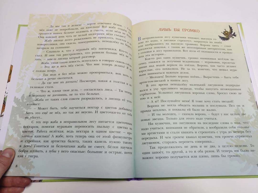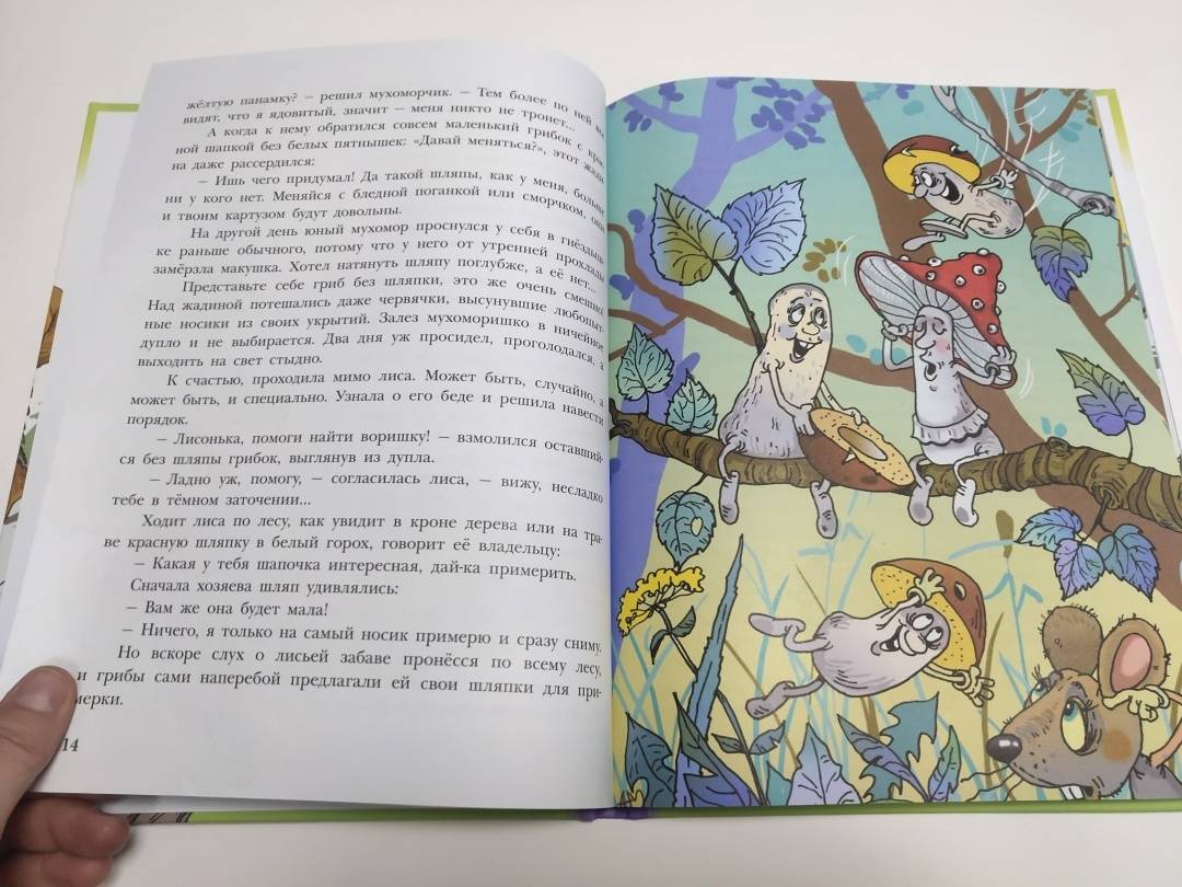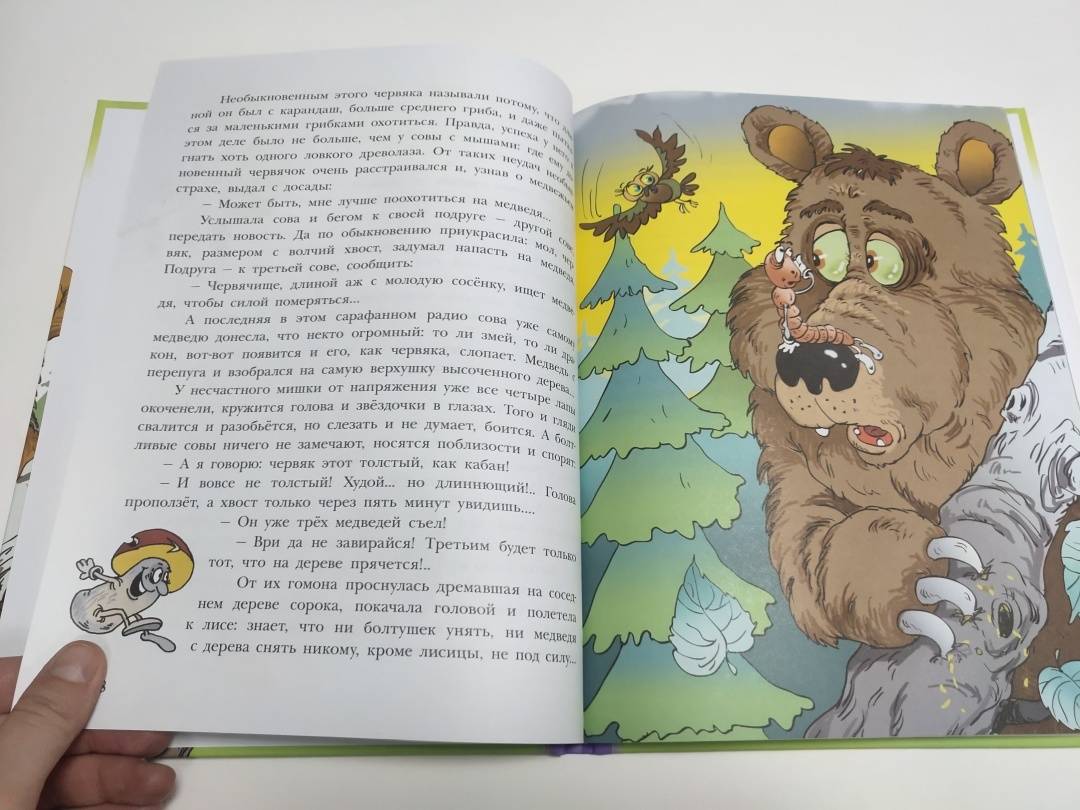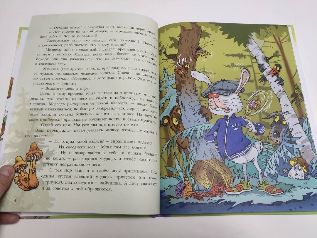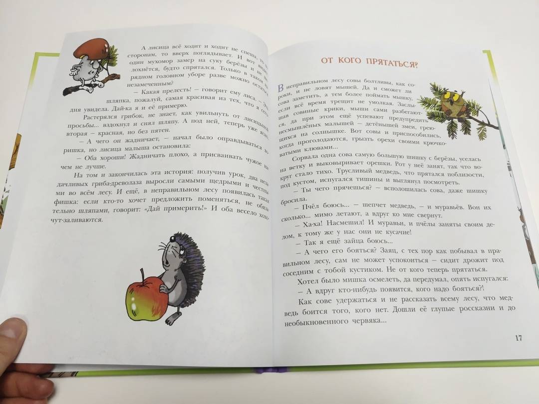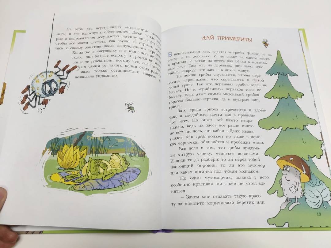 В неправильном лесу всё перепутано: сосновые шишки растут на берёзах, а еловые - на осинах; осенью с елей и сосен облетают иголки, а листья на других деревьях остаются зелёными круглый год; трава там синяя, а вода в ручье - зелёная.Грибы ловко лазают по деревьям и охотятся за гусеницами. Чтобы их самих не съели, придумали меняться шляпками - так что не разберёшь: ядовитый он или съедобный.Злой и хитрый заяц обижает волков.Жаба живёт на дереве, птенцов высиживают ёжики, а пауки плетут паутины только для того, чтобы лесные жители могли слушать, как ветер играет на их струнах.И каждый день в этом лесу происходит что-то неправильное! Что именно? Читайте - и узнаете!Для младшего школьного возраста.Весёлые маленькие сказки о невероятных событиях, происходящих в неправильном лесу с прикольными иллюстрациями Андрея Минякова. -