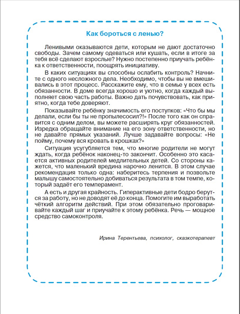 ОписаниеКак помочь маленькому нехочухе стать самостоятельным и трудолюбивым? Как сформировать у малыша чувство ответственности? С этой книгой вы легко и просто, без скучной назидательности улучшите поведение вашего сына или дочки. Опытный психолог и сказкотерапевт Ирина Терентьева сделала специальную подборку из произведений любимых детских писателей Э. Успенского, Е. Пермяка, С. Прокофьевой и др., а также подготовила вопросы для беседы с ребенком. Читая сказки, обсуждая сюжеты и поступки героев, малыш научится самостоятельно принимать решения, трудиться и обретёт уверенность в себе.Для дошкольного возраста.Малыш не хочет одеваться самостоятельно? Комната завалена игрушками, а прогулка превращается в бесконечные просьбы «возьми меня на ручки»? С этой проблемой можно справиться без истерик и капризов с помощью книги «Сказки от лени». Опытный психолог и сказкотерапевт Ирина Терентьева подскажет, что делать с маленькими нехочухами. В книге собраны сказки любимых отечественных авторов Э. Успенского, С. Прокофьевой и др., герои которых покажут, как хорошо быть трудолюбивым и аккуратным. Специальные вопросы к сказкам помогут найти общий язык с вашим сыном или дочкой.