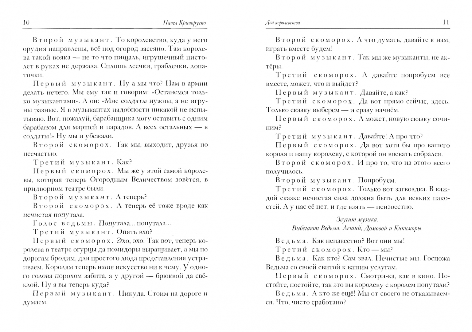 ОписаниеВ книгу вошли три музыкальные пьесы-сказки и сборник стихотворений "У лесного порога". Пьеса "Два королевства" рассказывает о том, как злая ведьма заколдовала бравого короля Фельдфебелиуса и хлебосольную королеву Редиску. И как влюблённые принц и принцесса смогли победить чары злой ведьмы.Пьеса "Кто я?" написана по сказке Г.-Х. Андерсена "Гадкий утёнок".Пьеса "Следы Деда Мороза ведут в Эрмитаж" описывает новогодние приключения Деда Мороза и его друзей в Петербурге - на Дворцовой площади и в Эрмитаже.Музыку к сказкам написал петербургский композитор Николай Криворучко. Сборник стихов состоит из трёх частей. Первая часть, "У лесного порога" - стихи лирической тематики. Вторая часть, "Дома, в городе, везде…" - стихи для детей. Третья часть, "Печатные дни" - стихи на произвольные темы.В книгу вошли три музыкальные пьесы-сказки и сборник стихотворений "У лесного порога". Пьеса "Два королевства" рассказывает о том, как злая ведьма заколдовала бравого короля Фельдфебелиуса и хлебосольную королеву Редиску. И как влюблённые принц и принцесса смогли победить чары злой ведьмы.Пьеса "Кто я?" написана по сказке Г.-Х. Андерсена "Гадкий утёнок".Пьеса "Следы Деда Мороза ведут в Эрмитаж" описывает новогодние приключения Деда Мороза и его друзей в Петербурге - на Дворцовой площади и в Эрмитаже.Музыку к сказкам написал петербургский композитор Николай Криворучко. Сборник стихов состоит из трёх частей. Первая часть, "У лесного порога" - стихи лирической тематики. Вторая часть, "Дома, в городе, везде…" - стихи для детей. Третья часть, "Печатные дни" - стихи на произвольные темы.