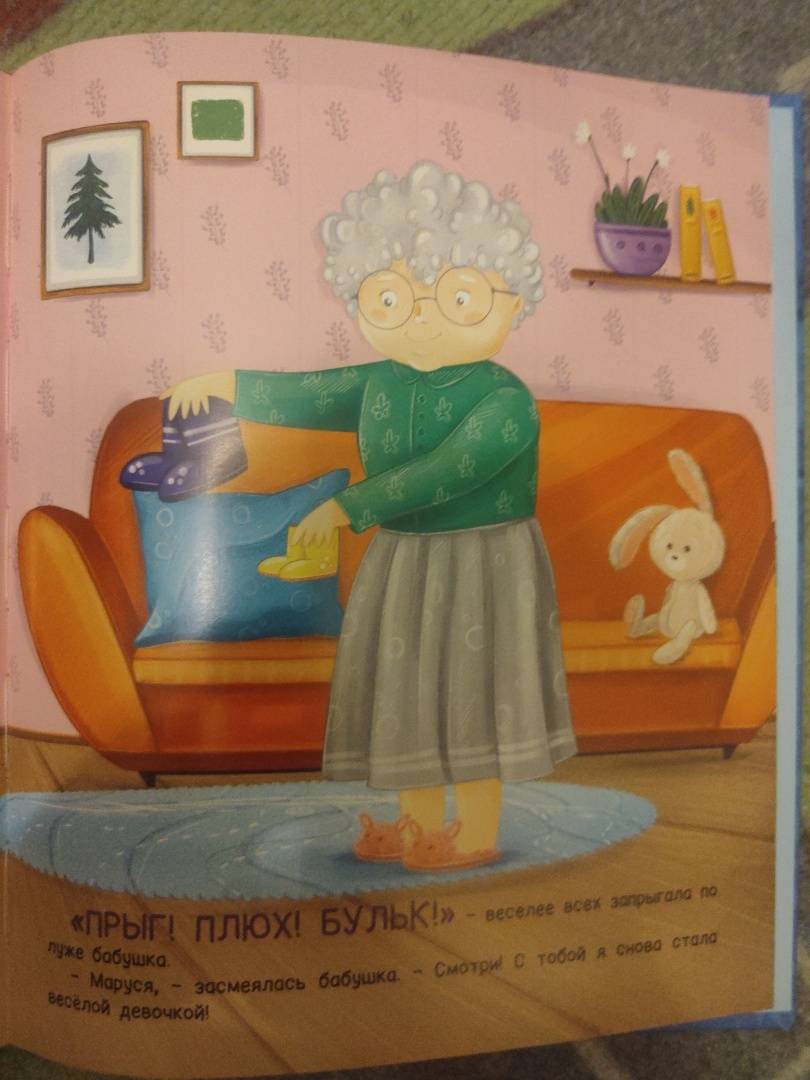 ОписаниеВеселая история о бабушке, которая приехала в гости к внучке Марусе. Целую неделю Маруся учит бабушку детским шалостям и забавам: пускать мыльные пузыри, кататься с горки и, конечно, прыгать по лужам. Каждый день, с понедельника по воскресенье, бабушка играет с Марусей, становясь веселей, задорнее и немножко моложе.Для чтения взрослыми детям.Веселая история о бабушке, которая приехала в гости к внучке Марусе. Целую неделю Маруся учит бабушку детским шалостям и забавам: пускать мыльные пузыри, кататься с горки и, конечно, прыгать по лужам. Каждый день, с понедельника по воскресенье, бабушка играет с Марусей, становясь веселей, задорнее и немножко моложе.Для чтения взрослыми детям.