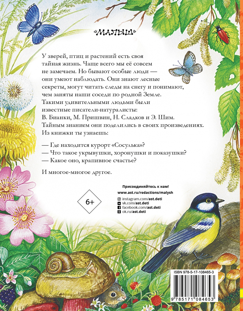 Объем, стр. 224 ISBN 978-5-17-108465-3 Автор Бианки Виталий Валентинович, Пришвин Михаил Михайлович, Сладков Николай Иванович, Цыганков Иван Александрович Художник Цыганков Иван Антонович Серия Любимые истории для детей Минимальный возраст 6+ Год издания книги 2021 Тип обложки Твердый переплет Иллюстрации Цветные Вес, г 503 Размеры 217х166х19 мм - Отзывы