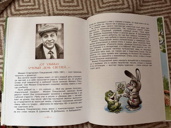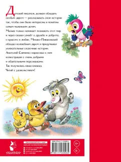 ОписаниеМихаил Пляцковский - поэт-песенник, драматург и детский писатель. Он сочинил известные детские песни: "Улыбка", "Чему учат в школе", "Дважды два - четыре" и многие другие. В нашей книге читатели познакомятся с М. Пляцковским как с писателем-сказочником. Он придумал сказки о маленьких зверятах. Они дружат, ссорятся, мечтают совершить что-то великое и знакомятся с окружающим миром совсем как человеческие дети. А ведь интереснее всего читать о тех, кто так похож на тебя самого!Анатолий Савченко - известный художник-мультипликатор, иллюстратор детских книг. Его рисунки похожи на мягкие игрушки - пушистые и очаровательные. Он нарисовал иллюстрации к сказкам М. Пляцковского. Малыши не только прочитают сказку, но и увидят утёнка Крячика, жирафа Долговязика, бегемотика Булочку и других сказочных героев.В конце книги даны статьи о писателе Михаиле Пляцковском и художнике Анатолии Савченко. Вы не только познакомитесь с замечательными сказками и картинками, но и больше узнаете о создателях этой книги.Для дошкольного возраста.СвернутьМихаил Пляцковский - поэт-песенник, драматург и детский писатель. Он сочинил известные детские песни: "Улыбка", "Чему учат в школе", "Дважды два - четыре" и многие другие. В нашей книге читатели познакомятся с М. Пляцковским как с писателем-сказочником. Он придумал сказки о маленьких зверятах. Они дружат, ссорятся, мечтают совершить что-то великое и знакомятся с окружающим миром совсем как человеческие дети. А ведь интереснее всего читать о тех, кто так похож на тебя самого!Анатолий Савченко - известный художник-мультипликатор, иллюстратор детских книг. Его рисунки похожи на мягкие игрушки - пушистые и очаровательные. Он нарисовал иллюстрации к сказкам М. Пляцковского. Малыши не только прочитают сказку, но и увидят утёнка Крячика, жирафа Долговязика, бегемотика Булочку и других сказочных героев.В конце книги даны статьи о писателе Михаиле Пляцковском и художнике Анатолии Савченко. Вы не только познакомитесь с замечательными сказками и картинками, но и больше узнаете о создателях этой книги.Для дошкольного возраста.СвернутьСвернуть