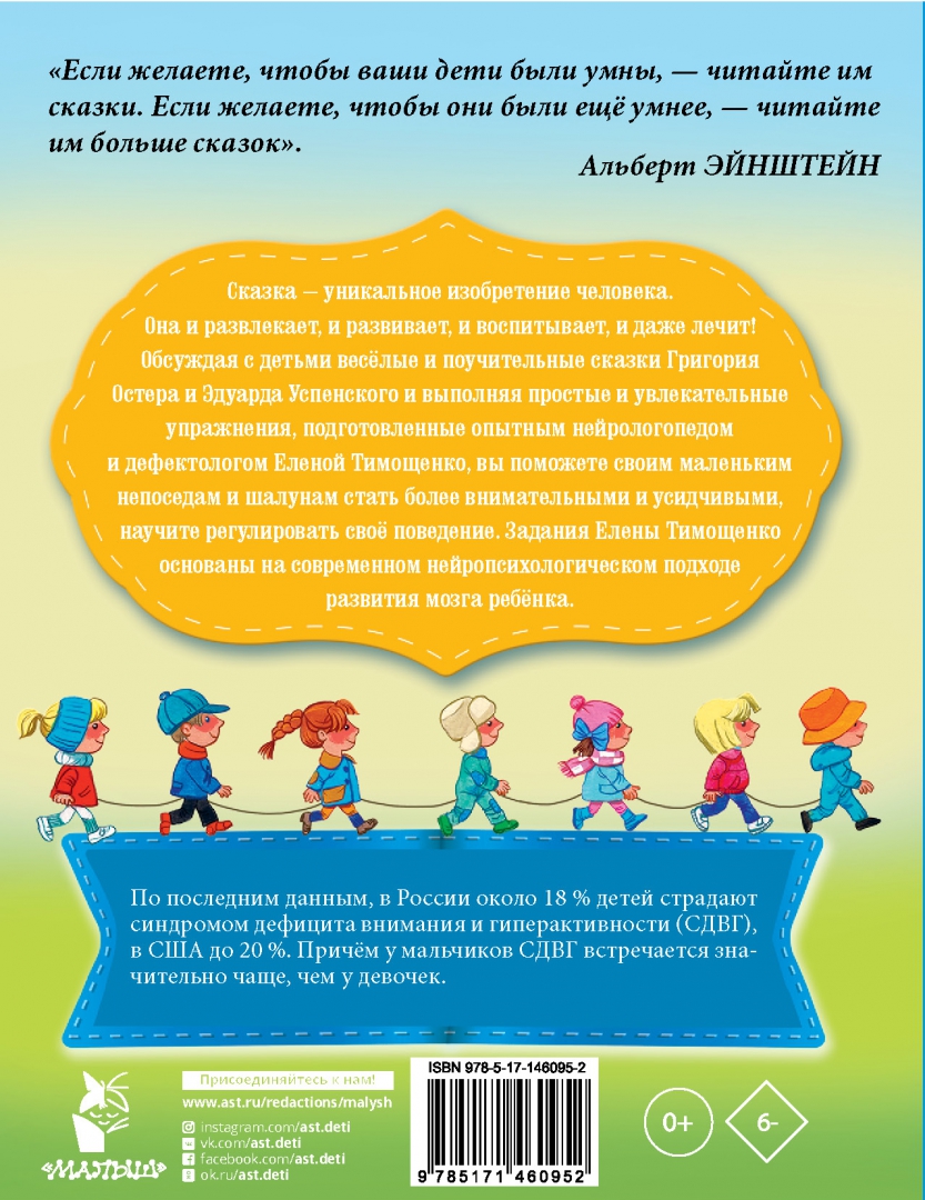 ОписаниеСказка — уникальное изобретение человека. Она и развлекает, и развивает, и воспитывает, и даже лечит! Обсуждая с детьми весёлые и поучительные сказки Григория Остера и Эдуарда Успенского и выполняя простые и увлекательные упражнения, подготовленные опытным нейрологопедом и дефектологом Еленой Тимощенко, вы поможете своим маленьким непоседам и шалунам стать более внимательными и усидчивыми, научите регулировать своё поведение. Подход Елены Тимощенко основан на современном нейропсихологическом методе развития мозга ребёнка.Для дошкольного возраста.Сказка — уникальное изобретение человека. Она и развлекает, и развивает, и воспитывает, и даже лечит! Обсуждая с детьми весёлые и поучительные сказки Григория Остера и Эдуарда Успенского и выполняя простые и увлекательные упражнения, подготовленные опытным нейрологопедом и дефектологом Еленой Тимощенко, вы поможете своим маленьким непоседам и шалунам стать более внимательными и усидчивыми, научите регулировать своё поведение. Подход Елены Тимощенко основан на современном нейропсихологическом методе развития мозга ребёнка.Для дошкольного возраста.