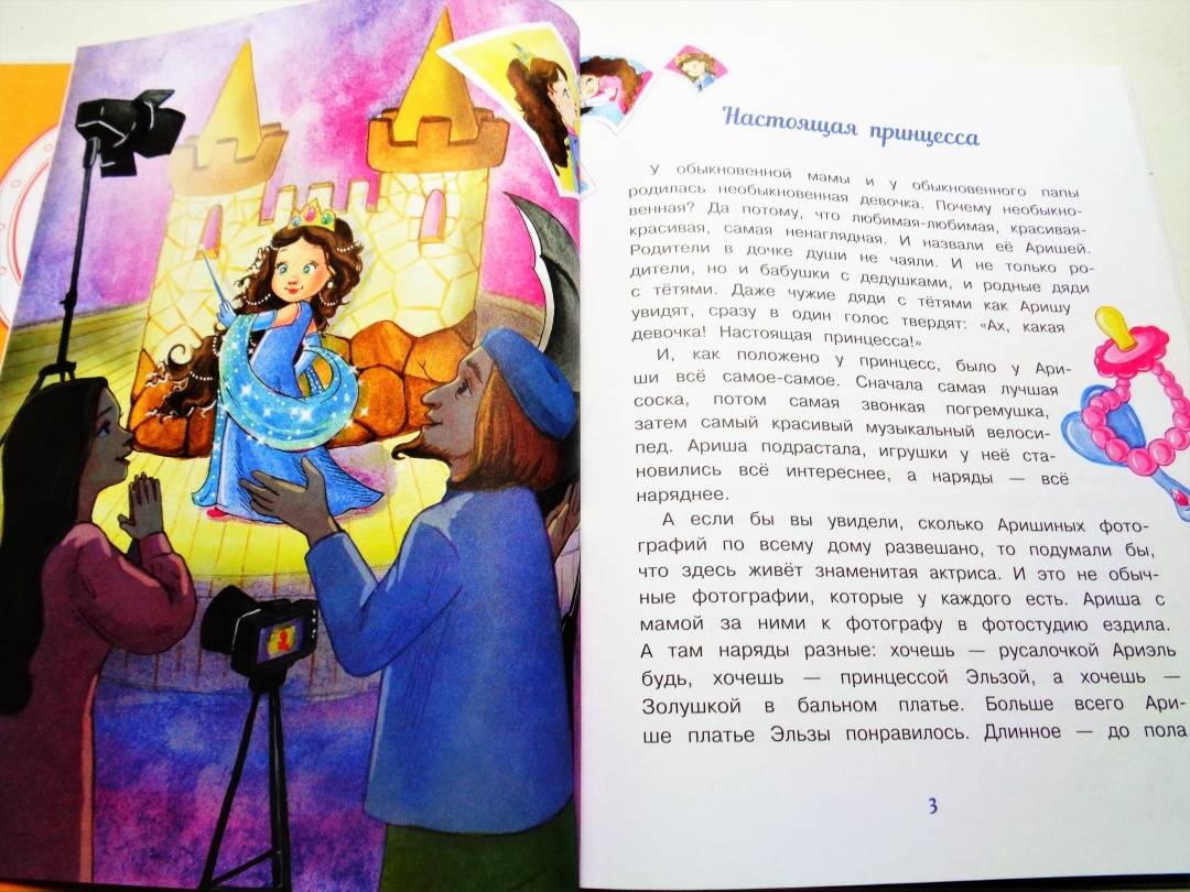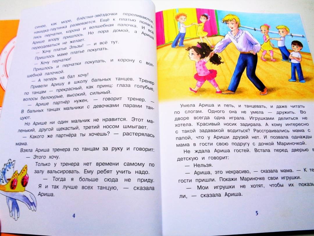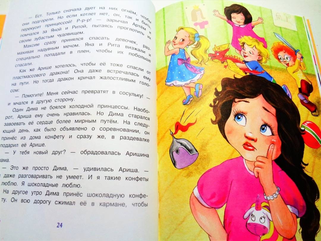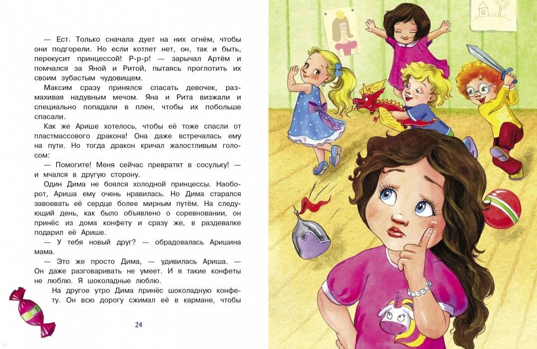 ОписаниеАриша росла как настоящая принцесса, всё у неё было самое лучшее - самые красивые игрушки, самые нарядные платья. Только друзей у Ариши не было. А всё потому, что в ней сидела маленькая и вредная воображуля! И вот однажды пришла Ариша в детский садик и оказалось, что там и без нее много принцесс. Воспитательница даже соревнование устроила, чтобы выбрать из всех принцесс - лучшую! Придётся Арише хорошенько постараться и многому научиться. Но всё не так страшно, когда рядом верный лопоухий рыцарь...Для детей дошкольного возраста.Ариша росла как настоящая принцесса, всё у неё было самое лучшее - самые красивые игрушки, самые нарядные платья. Только друзей у Ариши не было. А всё потому, что в ней сидела маленькая и вредная воображуля! И вот однажды пришла Ариша в детский садик и оказалось, что там и без нее много принцесс. Воспитательница даже соревнование устроила, чтобы выбрать из всех принцесс - лучшую! Придётся Арише хорошенько постараться и многому научиться. Но всё не так страшно, когда рядом верный лопоухий рыцарь...Для детей дошкольного возраста.