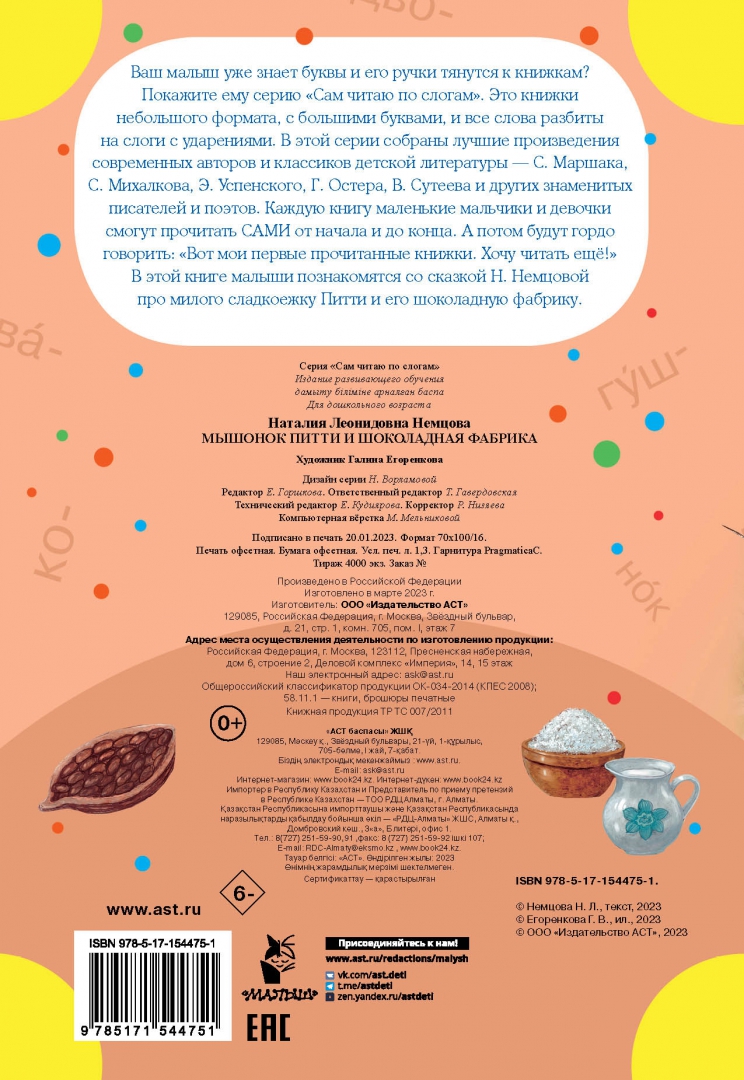 ОписаниеВаш малыш уже знает буквы и его ручки тянутся к книжкам?Покажите ему серию "Сам читаю по слогам". Это книжки небольшого формата, с большими буквами, и все слова разбиты на слоги с ударениями. В этой серии собраны лучшие произведения современных авторов и классиков детской литературы - С. Маршака, С. Михалкова, Э. Успенского, Г. Остера, В. Сутеева и других знаменитых писателей и поэтов. Каждую книгу маленькие мальчики и девочки смогут прочитать сами от начала и до конца. А потом будут гордо говорить: "Вот мои первые прочитанные книжки. Хочу читать ещё!". В этой книге малыши познакомятся со сказкой Н. Немцовой про милого сладкоежку Питти и его шоколадную фабрику.Для дошкольного возраста.Крупный шрифт, разбивка на слоги, ударения, запоминающиеся цветные иллюстрации - в книгах серии "Сам читаю по слогам" есть всё необходимое для формирования у ребенка прочного навыка чтения и стимулирования устойчивого интереса к книге.