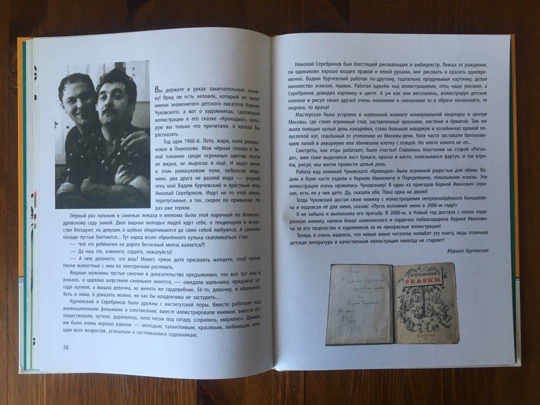 СвернутьКорней Иванович Чуковский не сразу стал детским писателем, сначала он был критиком, исследователем творчества Н. Некрасова и даже не думал писать что-то другое. А однажды взял и сочинил сказку "Крокодил". Это было в 1916 году. Потом появились и другие стихи и сказки для детей, и за К. Чуковским закрепилась слава детского писателя, классика детского литературы. Вадим Курчевский и Николай Серебряков были режиссёрами мультфильмов, сценаристами, художниками-постановщиками и книжными иллюстраторами. Рисунки к "Крокодилу" они рисовали вместе и много смеялись, создавая иллюстрации. И это веселье передалось героям книжки! Крокодил и остальные звери, захватившие Петроград, совсем не страшные, а, наоборот, смешные! Они не пугают маленьких читателей. Да и история с грозным Крокодилом заканчивается общим праздником детей и зверей!Корнею Чуковскому очень понравились рисунки весёлых художников. Теперь эта книжка перед вами. В книгу вошла статья Марины Курчевской, дочери художника. Из неё вы узнаете о работе художников над "Крокодилом" и познакомитесь с мастерами книжной иллюстрации.Для дошкольного возраста.Огромный важный Крокодил совершенно спокойно передвигался по улицам Петрограда и съедал всех, кто ему чем-то не нравился. И никто не мог с ним справиться. Да и не пытался! Все боялись клыкастой пасти. Пока не объявился один герой.