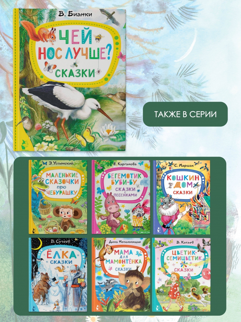 ОписаниеВиталий Валентинович Бианки - знаменитый писатель-натуралист. За всё время он написал более 300 произведений, и большинство из них - для детей. В своих рассказах и сказках Виталий Бианки по-новому раскрывает загадочный мир природы: он обращает внимание юного читателя на, казалось бы, обыкновенные вещи. Но в его произведениях они вдруг становятся удивительными и бесценными, будь то капля росы на траве или первый снег.В издание вошли лучшие сказки Виталия Бианки о природе - "Чей нос лучше?", "Терентий-Тетерев", "Кто чем поёт?" и другие.Рисунки известного современного художника И. Цыганкова.Для дошкольного возраста.Виталия Бианки, автора нашей книги, можно смело назвать настоящим переводчиком! Только переводил он, скажем, не с английского или китайского, а с языка животных – на человеческий. Он внимательно слушал, о чём щебечет соловей, квакает лягушка или стрекочет кузнечик, а затем пересказывал их необыкновенные истории в своих книгах. Виталий Бианки написал более трёхсот произведений о природе, самые лучше сказки знаменитого писателя-натуралиста вы найдёте в этой книге.