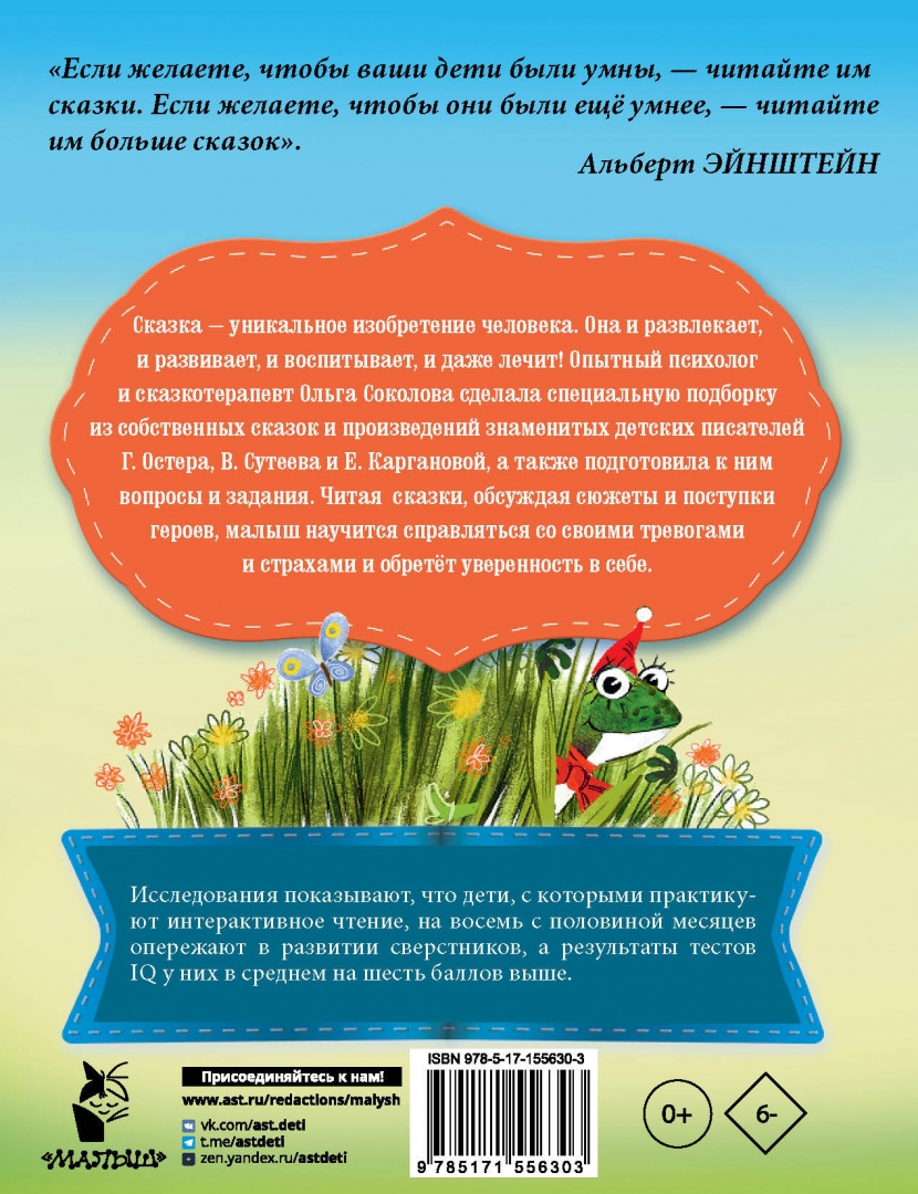 ОписаниеЧто делать, если малыш часто испытывает тревогу? Опытный психолог О. Соколова подскажет, откуда берётся повышенная тревожность и как с ней справиться при помощи сказкотерапии. Специально подобранные сказки В. Сутеева, Г. Остера, Е. Каргановой, О. Соколовой помогут выработать защитные психологические механизмы, чтобы тревожность не превратилась в невроз. Обсуждая сюжеты сказок и отвечая на вопросы, ребёнок научится регулировать своё эмоциональное состояние, обретёт уверенность в себе.Для дошкольного возраста.Малышу нужно пройти непростой путь, чтобы стать самостоятельным, многому научиться. Вокруг столько неизвестного, даже пугающего! Повышенная тревожность может помешать ребенку полноценно развиваться или превратится в невроз. Тогда на помощь приходит сказкотерапия. Добрые и умные сказки легко и быстро сформируют механизмы психологической защиты, правильную модель поведения. В эту книгу вошли сказки любимых писателей В. Сутеева, Г. Остера, Е. Каргановой со специальными вопросами психолога для беседы с ребенком. Красочная книга станет чудесным подарком для маленьких непосед. Читайте с пользой и удовольствием!