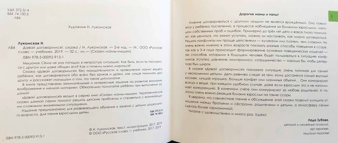 ОписаниеМышонок Сёма не раз попадал в непростую ситуацию. Как быть, если ты поссорился с другом или даже обидел его? Как и почему нужно мириться? Сказка "Давай договоримся!" без назидательности и нравоучений научит вашего ребёнка, как договариваться обо всём без криков и драки, как лучше понимать друг друга, и расскажет малышам о том, что такое дипломатия.В книге представлены занимательные и интересные задания на развитие внимания, воображения и мелкой моторики. Обязательно помогайте ребёнку при выполнении заданий!"Давай договоримся!" входит в серию книг "Сказки мамы-мышки". Терапевтические сказки данной серии помогут решить детские проблемы и справиться с возникающими сложными жизненными ситуациями.Издание предназначено для развивающего обучения и занятий с детьми дошкольного возраста. Для чтения взрослыми детям.2-е издание.Мышонок Сёма не раз попадал в непростую ситуацию. Как быть, если ты поссорился с другом или даже обидел его? Как и почему нужно мириться? Сказка "Давай договоримся!" без назидательности и нравоучений научит вашего ребёнка, как договариваться обо всём без криков и драки, как лучше понимать друг друга, и расскажет малышам о том, что такое дипломатия.В книге представлены занимательные и интересные задания на развитие внимания, воображения и мелкой моторики. Обязательно помогайте ребёнку при выполнении заданий!"Давай договоримся!" входит в серию книг "Сказки мамы-мышки". Терапевтические сказки данной серии помогут решить детские проблемы и справиться с возникающими сложными жизненными ситуациями.Издание предназначено для развивающего обучения и занятий с детьми дошкольного возраста. Для чтения взрослыми детям.2-е издание.