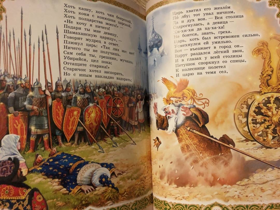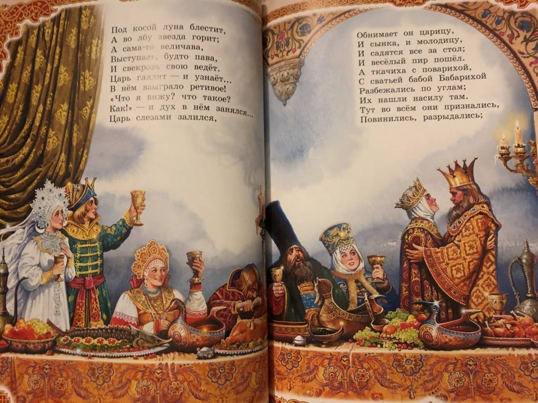 ОписаниеУже в дошкольном возрасте стоит прочитать малышам сказки А. С. Пушкина, познакомить их с чудесным сказочным миром, который он создал в своих произведениях и без которого мы уже не мыслим своё детство, свою жизнь, своё дальнейшее духовное развитие. Именно со сказок Пушкина начинается приобщение детей к русской литературе. В книгу вошли "Сказка о царе Салтане, о сыне его славном и могучем богатыре князе Гвидоне Салтановиче и о прекрасной царевне Лебеди", "Сказка о золотом петушке", "Сказка о попе и о работнике его Балде", "Сказка о мёртвой царевне и о семи богатырях" и "Сказка о рыбаке и рыбке". Несомненно, эти бессмертные творения доставят малышам много радостных минут. А благодаря иллюстрациям Виктора Нечитайло эти чудесные сказки словно оживают, превращая книгу в настоящий шедевр книжного искусства.Для младшего школьного возраста.Уже в дошкольном возрасте стоит прочитать малышам сказки А. С. Пушкина, познакомить их с чудесным сказочным миром, который он создал в своих произведениях и без которого мы уже не мыслим своё детство, свою жизнь, своё дальнейшее духовное развитие. Именно со сказок Пушкина начинается приобщение детей к русской литературе. В книгу вошли "Сказка о царе Салтане, о сыне его славном и могучем богатыре князе Гвидоне Салтановиче и о прекрасной царевне Лебеди", "Сказка о золотом петушке", "Сказка о попе и о работнике его Балде", "Сказка о мёртвой царевне и о семи богатырях" и "Сказка о рыбаке и рыбке". Несомненно, эти бессмертные творения доставят малышам много радостных минут. А благодаря иллюстрациям Виктора Нечитайло эти чудесные сказки словно оживают, превращая книгу в настоящий шедевр книжного искусства.Для младшего школьного возраста.