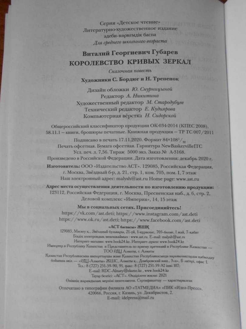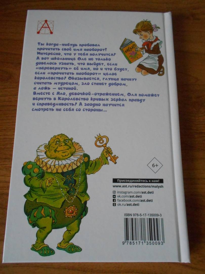 Описание«Королевство кривых зеркал» — сказочная повесть Виталия Губарева о двух девочках — школьнице Оле и её отражении — Яло, которые попали в сказочную страну, где всё перевёрнуто с ног на голову: тощих здесь считают толстыми, крошку хлеба — целой булкой. Но самое страшное, что зло здесь выдают за добро, глупость — за ум, ложь — за правду. Оле и Яло предстоит пройти немало опасных испытаний, изменить мир вокруг и измениться самим.Для среднего школьного возраста.«Королевство кривых зеркал» — сказочная повесть Виталия Губарева о двух девочках — школьнице Оле и её отражении — Яло, которые попали в сказочную страну, где всё перевёрнуто с ног на голову: тощих здесь считают толстыми, крошку хлеба — целой булкой. Но самое страшное, что зло здесь выдают за добро, глупость — за ум, ложь — за правду. Оле и Яло предстоит пройти немало опасных испытаний, изменить мир вокруг и измениться самим.Для среднего школьного возраста.