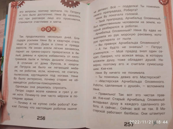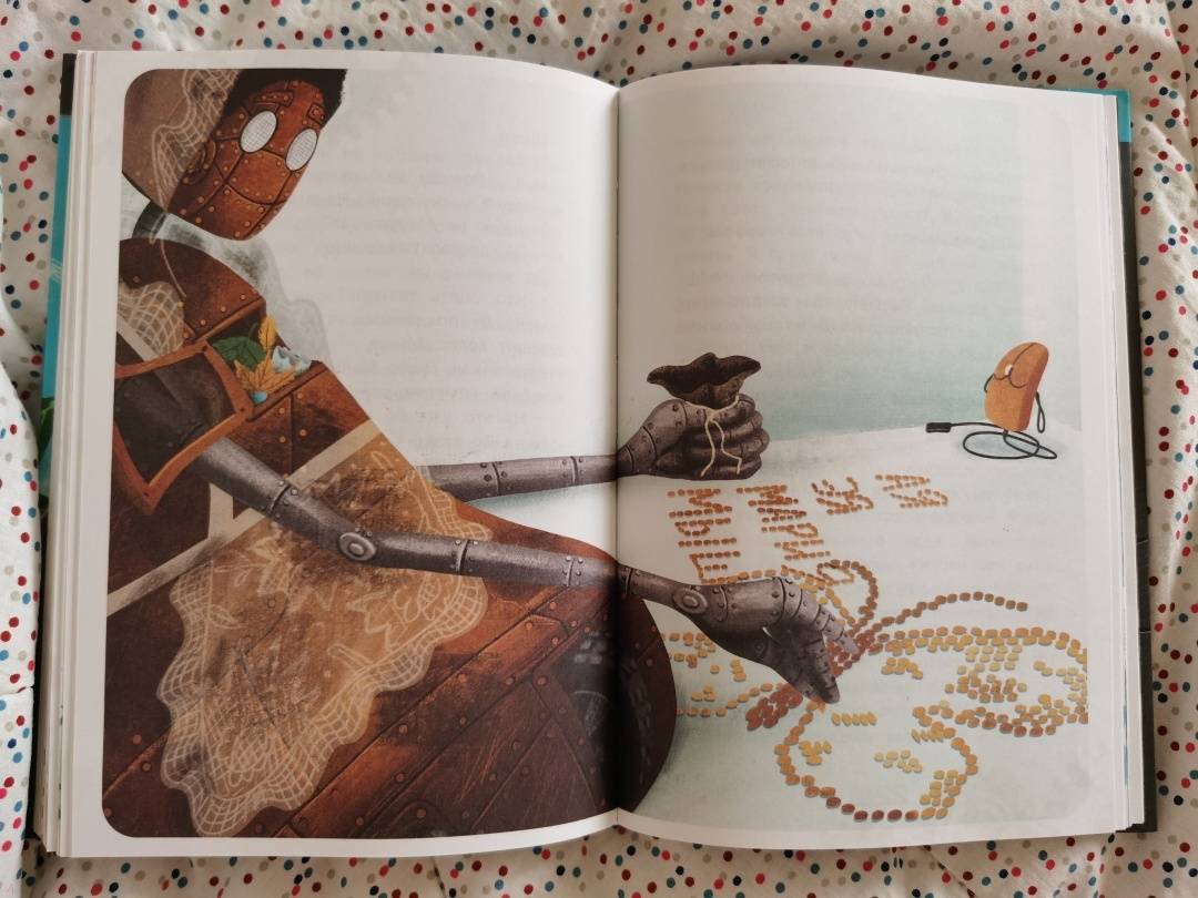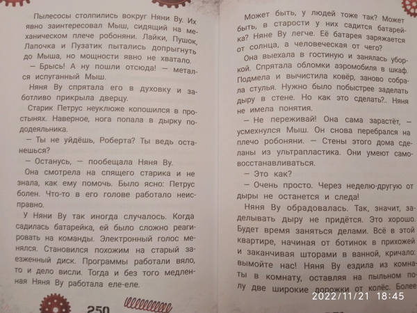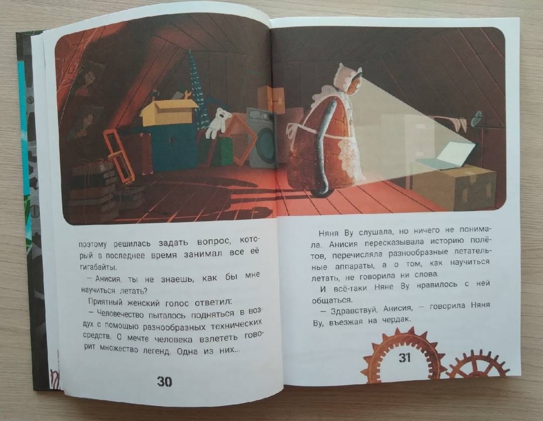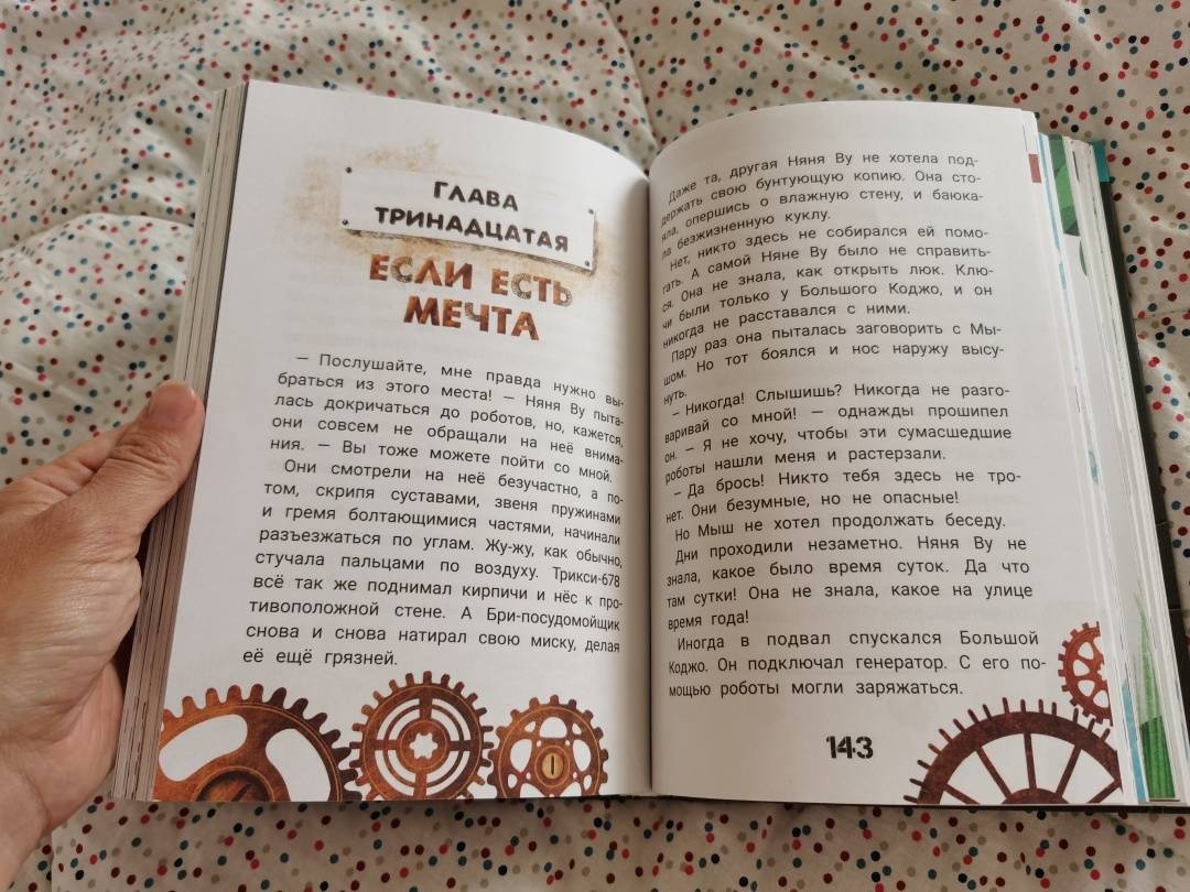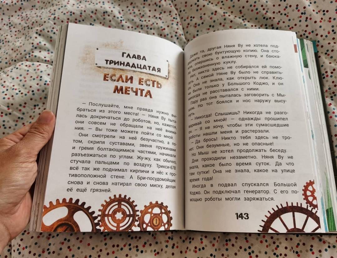 ОписаниеЧто за шум на чердаке? Это после многих лет включился и ожил старый робот! Робоняня Ву воспитала три поколения семьи Фуксов. Она не обладает суперспособностями, но прекрасно умеет сидеть с детьми: готовить кашу, вытирать пыль, рассказывать сказки… По сравнению с новыми роботами она выглядит очень медлительной. Ещё бы, ведь они умеют летать! А Няня Ву мечтает только об одном - быть нужной для своих хозяев. Не имеет значения, что она похожа на помесь пылесоса с духовкой: даже устаревшая модель робота способна мечтать и стремиться стать лучше. И тогда всё по силам, нужно только добраться до Мастерской Арчибальда Оловянного, где её собрали много лет назад…Ксения Горбунова - писатель, журналист, сценарист. Лауреат конкурсов "Новая детская книга", "Хрустальный родник" и "Большая сказка", финалист Международного фестиваля детской литературы "Корнейчуковская премия". Фантазия автора легко одушевляет даже механизмы - и они становятся в один ряд с персонажами фильма "ВАЛЛ-И" и рассказа "Электрическое тело пою!" Рэя Брэдбери. И находят своё истинное предназначение, с удивлением понимая, что оно не всегда совпадает с прописанными для них инструкциями. Проиллюстрировала сказку художница Елена Кураш, уже известная читателям по оформлению книг "Василькин Д. Седьмой отряд" и "Принцесса Торнада".Для младшего школьного возраста.СвернутьЧто за шум на чердаке? Это после многих лет включился и ожил старый робот! Робоняня Ву воспитала три поколения семьи Фуксов. Она не обладает суперспособностями, но прекрасно умеет сидеть с детьми: готовить кашу, вытирать пыль, рассказывать сказки… По сравнению с новыми роботами она выглядит очень медлительной. Ещё бы, ведь они умеют летать! А Няня Ву мечтает только об одном - быть нужной для своих хозяев. Не имеет значения, что она похожа на помесь пылесоса с духовкой: даже устаревшая модель робота способна мечтать и стремиться стать лучше. И тогда всё по силам, нужно только добраться до Мастерской Арчибальда Оловянного, где её собрали много лет назад…Ксения Горбунова - писатель, журналист, сценарист. Лауреат конкурсов "Новая детская книга", "Хрустальный родник" и "Большая сказка", финалист Международного фестиваля детской литературы "Корнейчуковская премия". Фантазия автора легко одушевляет даже механизмы - и они становятся в один ряд с персонажами фильма "ВАЛЛ-И" и рассказа "Электрическое тело пою!" Рэя Брэдбери. И находят своё истинное предназначение, с удивлением понимая, что оно не всегда совпадает с прописанными для них инструкциями. Проиллюстрировала сказку художница Елена Кураш, уже известная читателям по оформлению книг "Василькин Д. Седьмой отряд" и "Принцесса Торнада".Для младшего школьного возраста.СвернутьСвернуть