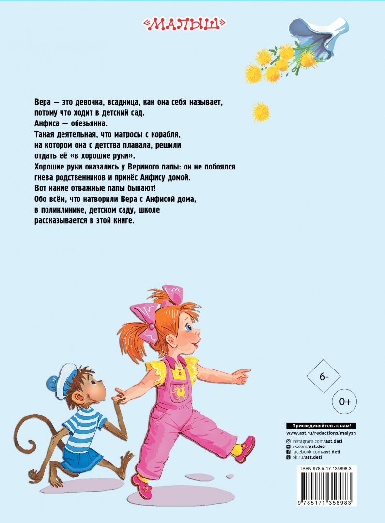 ОписаниеСерия "Главные книги для детей" - это произведения, без которых полка детской литературы в домашней библиотеке просто немыслима. Истории про серьезную дошкольницу Веру и ее озорную подружку-обезьянку читать невероятно интересно, ведь каждый ребенок представляет себя на месте счастливой девочки, которой родители разрешили завести дикое животное. Ох и намучилась вся семья с Анфисой! В книгу вошли все классические истории про Веру и Анфису. Для младшего школьного возраста.Серия "Главные книги для детей" - это произведения, без которых полка детской литературы в домашней библиотеке просто немыслима. Истории про серьезную дошкольницу Веру и ее озорную подружку-обезьянку читать невероятно интересно, ведь каждый ребенок представляет себя на месте счастливой девочки, которой родители разрешили завести дикое животное. Ох и намучилась вся семья с Анфисой! В книгу вошли все классические истории про Веру и Анфису. Для младшего школьного возраста.