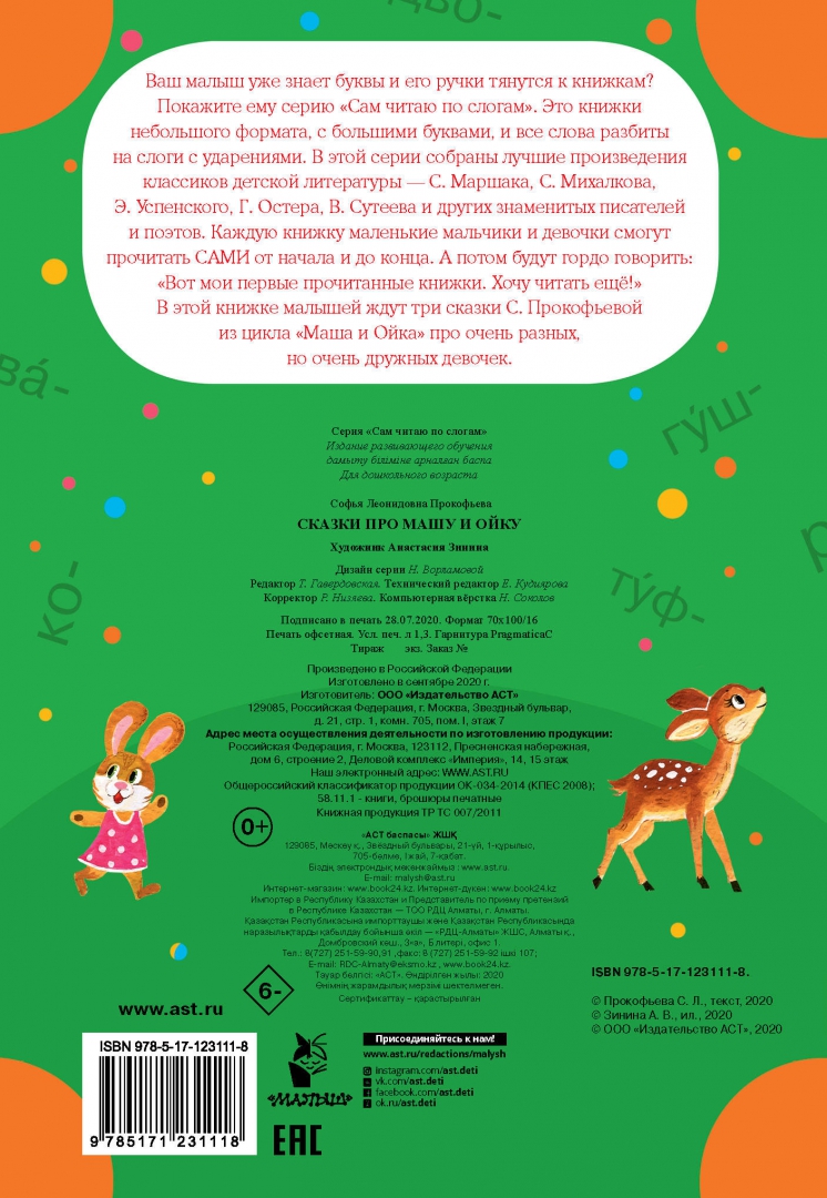 ОписаниеВаш малыш уже знает буквы и его ручки тянутся к книжкам? Покажите ему серию «Сам читаю по слогам». Это книжки небольшого формата, с большими буквами, и все слова разбиты на слоги с ударениями. В этой серии собраны лучшие произведения классиков детской литературы — С. Маршака, С. Михалкова, Э. Успенского, Г. Остера, В. Сутеева и других знаменитых писателей и поэтов. Каждую книжку маленькие мальчики и девочки смогут прочитать САМИ от начала и до конца. А потом будут гордо говорить: «Вот мои первые прочитанные книжки. Хочу читать ещё!» В этой книжке малышей ждут три сказки С. Прокофьевой из цикла «Маша и Ойка» про очень разных, но очень дружных девочек.Для дошкольного возраста.Ваш малыш уже знает буквы и его ручки тянутся к книжкам? Покажите ему серию «Сам читаю по слогам». Это книжки небольшого формата, с большими буквами, и все слова разбиты на слоги с ударениями. В этой серии собраны лучшие произведения классиков детской литературы — С. Маршака, С. Михалкова, Э. Успенского, Г. Остера, В. Сутеева и других знаменитых писателей и поэтов. Каждую книжку маленькие мальчики и девочки смогут прочитать САМИ от начала и до конца. А потом будут гордо говорить: «Вот мои первые прочитанные книжки. Хочу читать ещё!» В этой книжке малышей ждут три сказки С. Прокофьевой из цикла «Маша и Ойка» про очень разных, но очень дружных девочек.Для дошкольного возраста.
