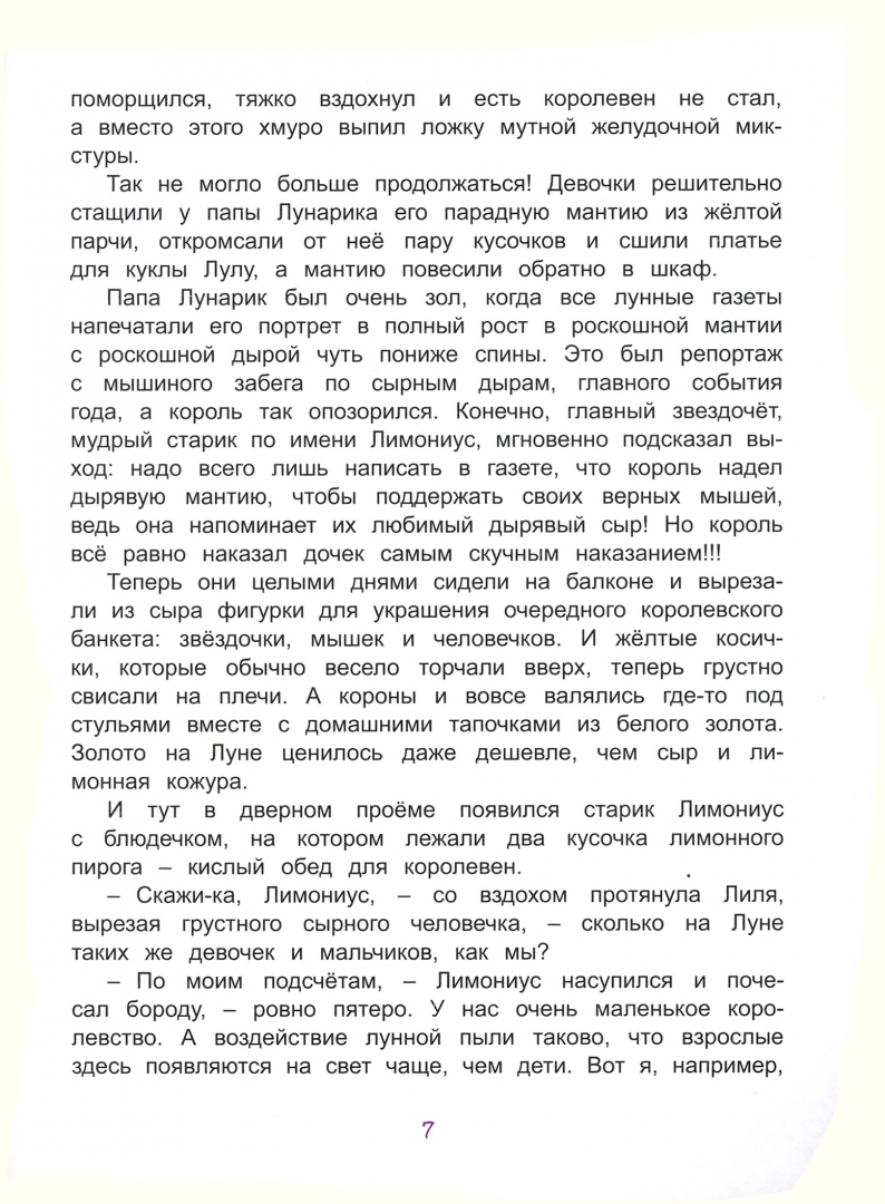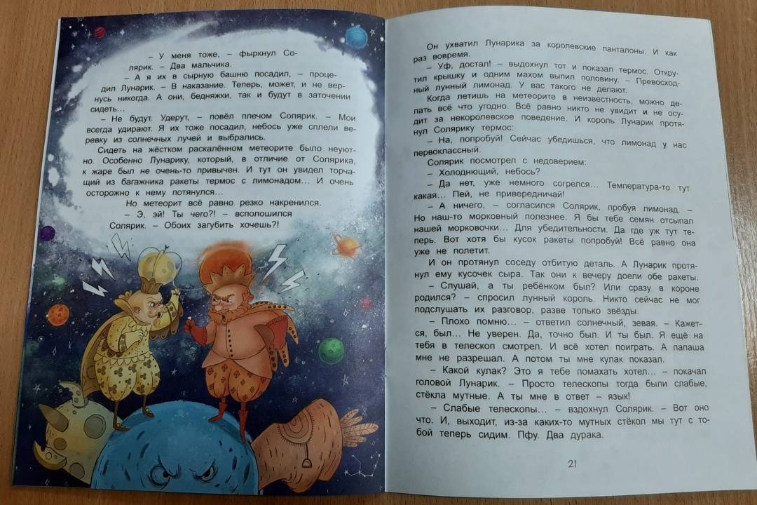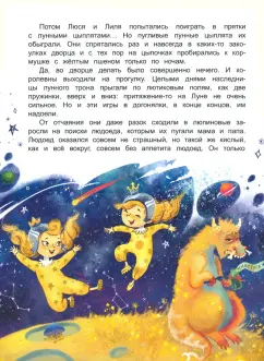 ОписаниеЕсли присмотреться, можно увидеть на Луне Лунное королевство. А на Солнце – Солнечное. Король Солярик командует армией солнечных зайцев, а король Лунарик – армией лунных мышей! Вот только друг друга они терпеть не могут. Тут недалеко и до космической войны… К счастью, у королей тоже бывают дети. А дети, пока не станут взрослыми, отлично знают, что воевать – самое глупое в мире дело… Всегда лучше вовремя охладиться!Книга адресована детям от 5 лет.Если присмотреться, можно увидеть на Луне Лунное королевство. А на Солнце – Солнечное. Король Солярик командует армией солнечных зайцев, а король Лунарик – армией лунных мышей! Вот только друг друга они терпеть не могут. Тут недалеко и до космической войны… К счастью, у королей тоже бывают дети. А дети, пока не станут взрослыми, отлично знают, что воевать – самое глупое в мире дело… Всегда лучше вовремя охладиться!Книга адресована детям от 5 лет.