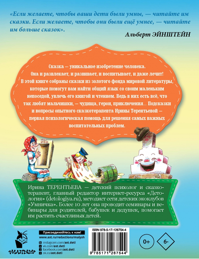 ОписаниеСказка — уникальное изобретение человека. Она и развлекает, и развивает, и воспитывает, и даже лечит! В этой книге собраны сказки из золотого фонда мировой литературы, которые помогут вам найти общий язык со своим маленьким непоседой, увлечь его книгой и чтением. Ведь в них есть всё, что так любят мальчишки, — чудища, герои, приключения… Подсказки и вопросы опытного сказкотерапевта Ирины Терентьевой — первая психологическая помощь для решения самых важных воспитательных проблем.Для дошкольного возраста.Сказка — уникальное изобретение человека. Она и развлекает, и развивает, и воспитывает, и даже лечит! В этой книге собраны сказки из золотого фонда мировой литературы, которые помогут вам найти общий язык со своим маленьким непоседой, увлечь его книгой и чтением. Ведь в них есть всё, что так любят мальчишки, — чудища, герои, приключения… Подсказки и вопросы опытного сказкотерапевта Ирины Терентьевой — первая психологическая помощь для решения самых важных воспитательных проблем.Для дошкольного возраста.