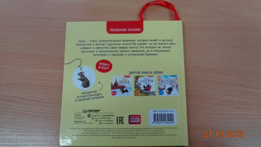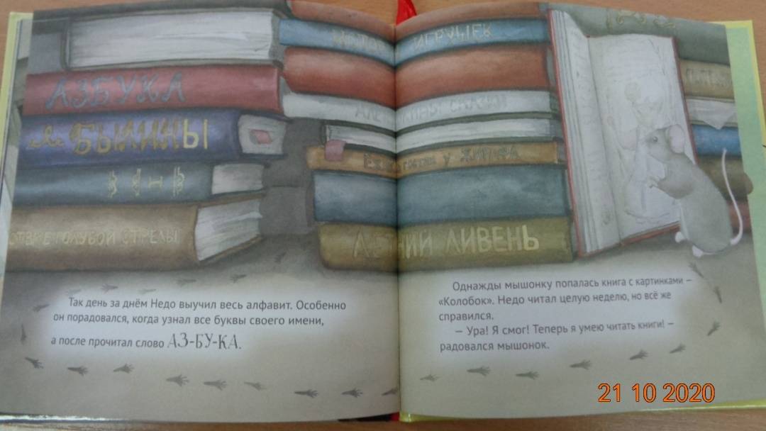 ОписаниеНедо - очень любознательный мышонок, живущий в детской библиотеке. Однажды ему в голову приходит необычная для зверька идея - он решает научиться читать! Теперь каждый день Недо прибегает к библиотечной стойке, чтобы встретиться с детьми и выучить новые буквы. Но сможет ли Недо освоить весь алфавит и прочитать свою первую книгу? Эта история расскажет не только об упорстве и приключениях умного мышонка, но и познакомит маленьких читателей сперва с гласными, а после - с согласными буквами. Для чтения взрослыми детям старшего дошкольного возраста.Недо - очень любознательный мышонок, живущий в детской библиотеке. Однажды ему в голову приходит необычная для зверька идея - он решает научиться читать! Теперь каждый день Недо прибегает к библиотечной стойке, чтобы встретиться с детьми и выучить новые буквы. Но сможет ли Недо освоить весь алфавит и прочитать свою первую книгу? Эта история расскажет не только об упорстве и приключениях умного мышонка, но и познакомит маленьких читателей сперва с гласными, а после - с согласными буквами. Для чтения взрослыми детям старшего дошкольного возраста.