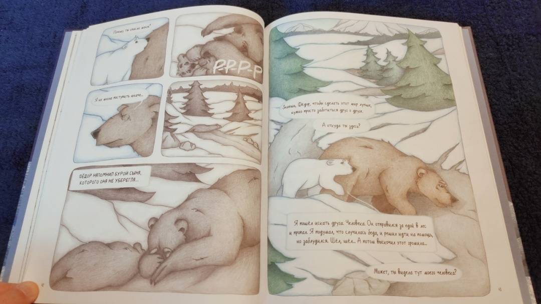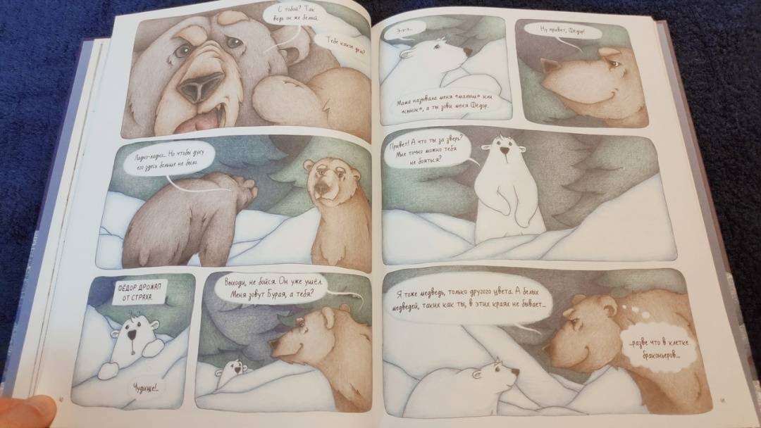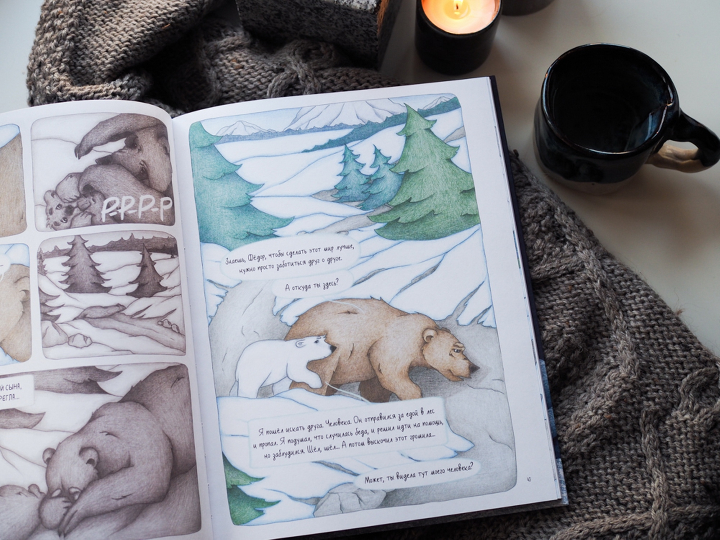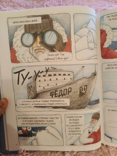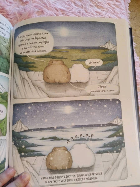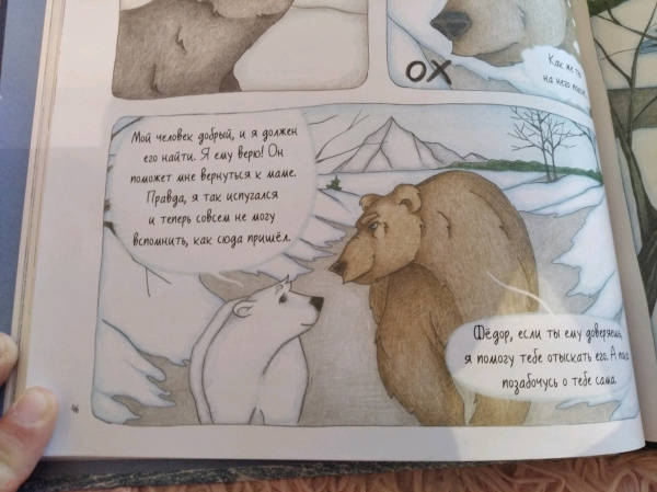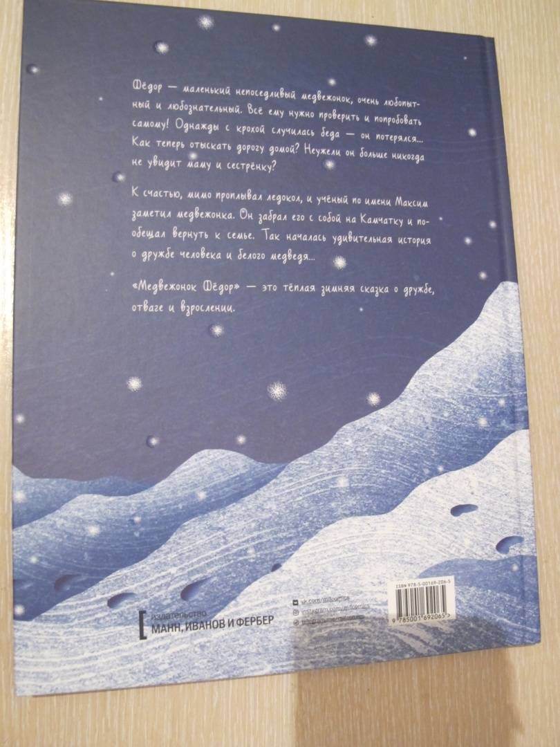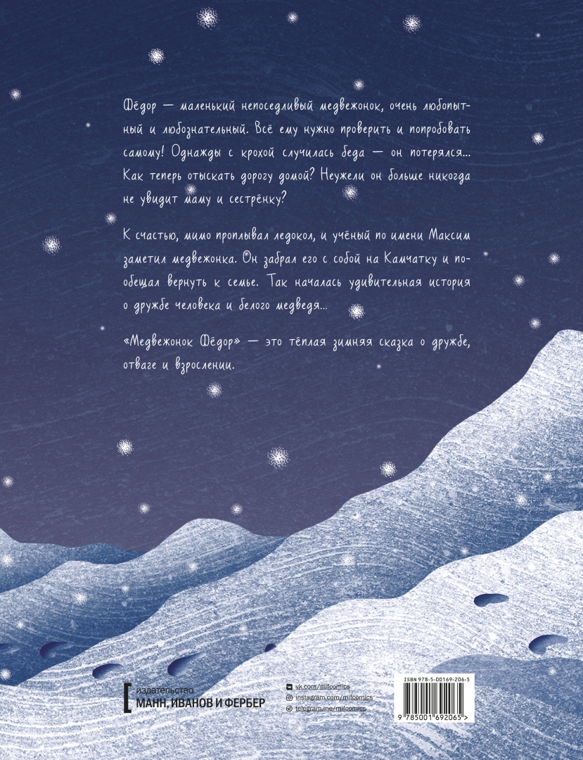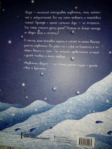 Описание"Медвежонок Фёдор" - это тёплая зимняя сказка о дружбе, отваге и самостоятельности.Фёдор - маленький непоседливый медвежонок, очень любопытный и любознательный. Всё ему нужно проверить и попробовать самому! Однажды с крохой случилась беда - он потерялся... и остался совсем один среди бескрайней Арктики. Как теперь отыскать дорогу домой? Неужели он больше никогда не увидит маму и сестрёнку?Хорошо, что мимо проплывал ледокол, и ученый по имени Максим заметил медвежонка. Может быть, этот человек поможет Федору вернуться домой, к семье?..Так и началась эта удивительная история о дружбе человека и белого медведя...Фишки книги- История поделена на три части, чтобы было удобно читать книгу перед сном- В книге много звукоподражательных междометий для развития речи- Иллюстрации в книге живые: автор специально рисовала все картинки от руки цветными карандашамиОт автораВсё началось в 2017 году... В тот момент я работала над детективной серией "Розовый слон" в качестве художника. Именно тогда мне жутко захотелось попробовать себя в роли сценариста.Идея родилась очень быстро - я с детства обожаю белых медведей, вот и решила для начала нарисовать простенькие стрипы про милого белого медвежонка. В процессе работы я поняла, что мне не хватает масштаба, что мне хочется рассказать гораздо больше, а для этого был нужен текст...В эту книгу я вложила очень много тепла и своей души. Каждую иллюстрацию я рисовала от руки цветными карандашами, поэтому они получились, на мой взгляд, очень живыми и уютными (знали бы вы, сколько раз я перерисовывала их :))Надеюсь, эта история будет согревать и детей, и взрослых!Большое спасибо Лилии Ш. за поддержку и помощь в создании истории и команде издательства, благодаря которой книга вышла в лучшем виде!Для кого эта книгаДля детей от 4 лет (совместное чтение с родителями)Для всех, кто любит душевные истории и уютные иллюстрацииДля детей, начинающих читать самостоятельноСвернуть"Медвежонок Фёдор" - это тёплая зимняя сказка о дружбе, отваге и самостоятельности.Фёдор - маленький непоседливый медвежонок, очень любопытный и любознательный. Всё ему нужно проверить и попробовать самому! Однажды с крохой случилась беда - он потерялся... и остался совсем один среди бескрайней Арктики. Как теперь отыскать дорогу домой? Неужели он больше никогда не увидит маму и сестрёнку?Хорошо, что мимо проплывал ледокол, и ученый по имени Максим заметил медвежонка. Может быть, этот человек поможет Федору вернуться домой, к семье?..Так и началась эта удивительная история о дружбе человека и белого медведя...Фишки книги- История поделена на три части, чтобы было удобно читать книгу перед сном- В книге много звукоподражательных междометий для развития речи- Иллюстрации в книге живые: автор специально рисовала все картинки от руки цветными карандашамиОт автораВсё началось в 2017 году... В тот момент я работала над детективной серией "Розовый слон" в качестве художника. Именно тогда мне жутко захотелось попробовать себя в роли сценариста.Идея родилась очень быстро - я с детства обожаю белых медведей, вот и решила для начала нарисовать простенькие стрипы про милого белого медвежонка. В процессе работы я поняла, что мне не хватает масштаба, что мне хочется рассказать гораздо больше, а для этого был нужен текст...В эту книгу я вложила очень много тепла и 