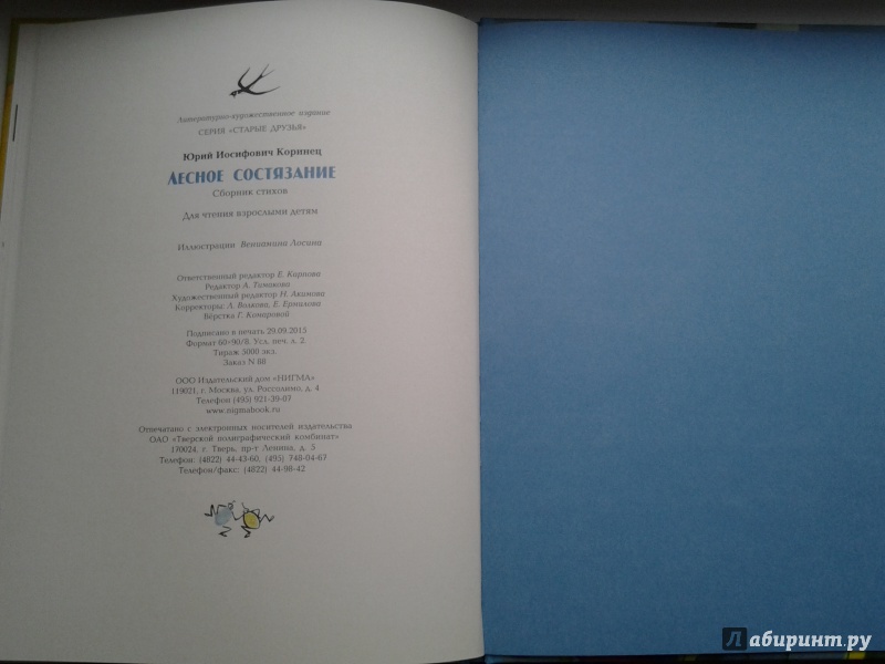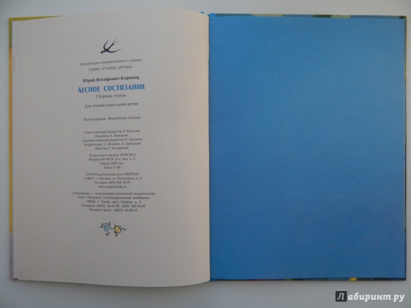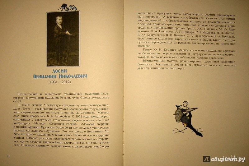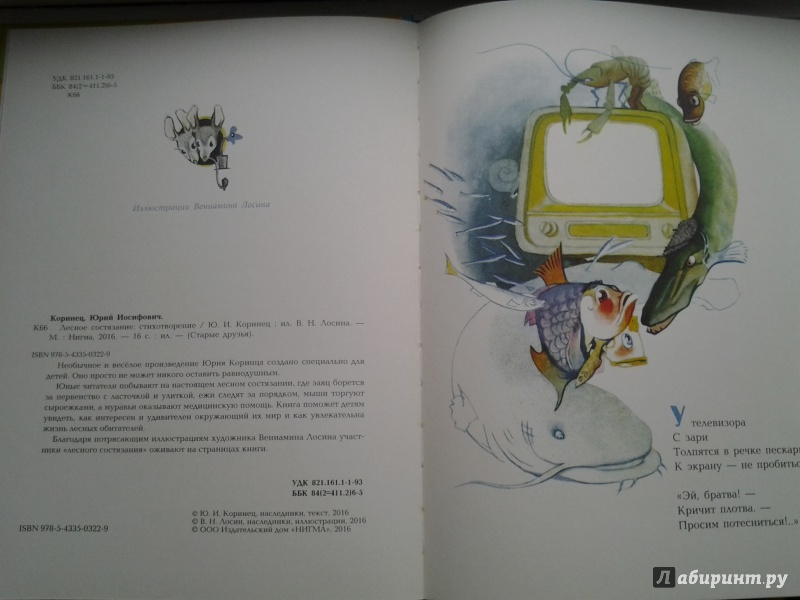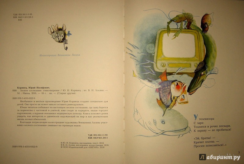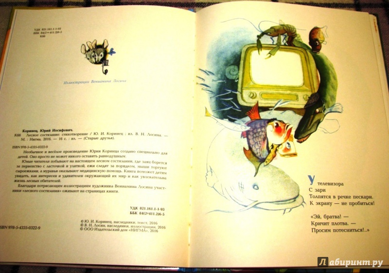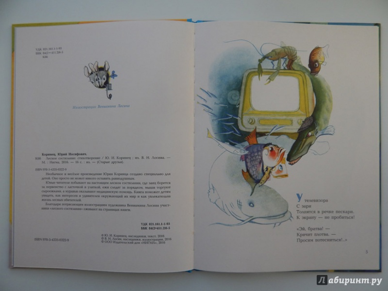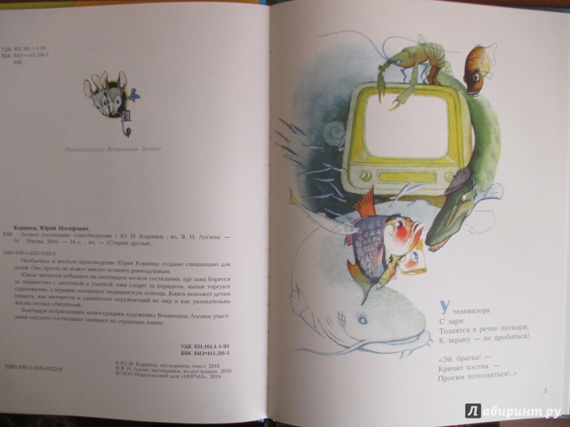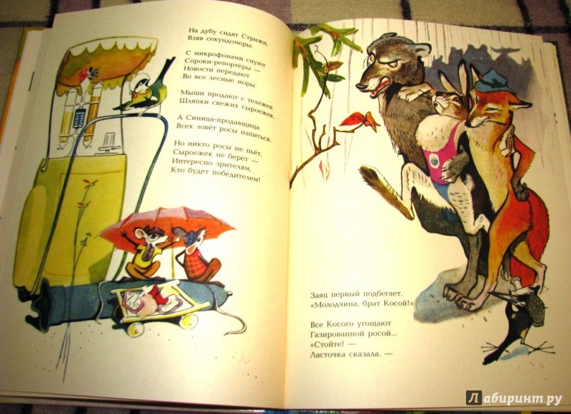 ОписаниеНеобычное и весёлое произведение Юрия Коринца создано специально для детей. Оно просто не может никого оставить равнодушным.Юные читатели побывают на настоящем лесном состязании, где заяц борется за первенство с ласточкой и улиткой, ежи следят за порядком, мыши торгуют сыроежками, а муравьи оказывают медицинскую помощь. Книга поможет детям увидеть, как интересен и удивителен окружающий их мир и как увлекательна жизнь лесных обитателей.Благодаря потрясающим иллюстрациям художника Вениамина Лосина участники "лесного состязания" оживают на страницах книги.Необычное и весёлое произведение Юрия Коринца создано специально для детей. Оно просто не может никого оставить равнодушным.Юные читатели побывают на настоящем лесном состязании, где заяц борется за первенство с ласточкой и улиткой, ежи следят за порядком, мыши торгуют сыроежками, а муравьи оказывают медицинскую помощь. Книга поможет детям увидеть, как интересен и удивителен окружающий их мир и как увлекательна жизнь лесных обитателей.Благодаря потрясающим иллюстрациям художника Вениамина Лосина участники "лесного состязания" оживают на страницах книги.