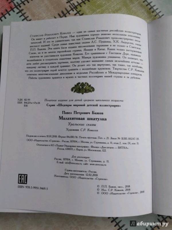 Объем, стр. 336 ISBN 978-5-9951-3469-5 Автор Бажов Павел Петрович, Ковалев Станислав Романович Художник Ковалев Станислав Романович Серия Шедевры мировой детской иллюстрации Минимальный возраст 12+ Год издания книги 2017 Тип обложки Твердый переплет Иллюстрации Цветные Вес, г 1138г Размеры 243х210х32 мм - Отзывы