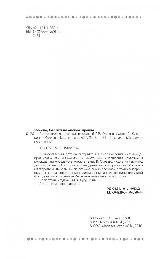 Объем, стр. 160 ISBN 978-5-17-106848-6 Автор Осеева Валентина Александровна, Кукушкин А. И. Художник Кукушкин А. И. Серия Дошкольное чтение Год издания книги 2018 Тип обложки Твердый переплет Иллюстрации Черно-белые Вес, г 210г Размеры 206х129х11 мм - Отзывы