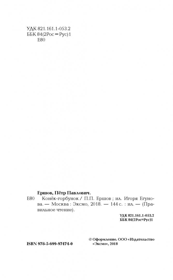 Объем, стр. 144 ISBN 978-5-699-97474-0 Автор Ершов Петр Павлович, Егунов Игорь Художник Егунов Игорь Серия Правильное чтение Минимальный возраст 6+ Год издания книги 2018 Тип обложки Твердый переплет Иллюстрации Черно-белые Вес, г 188г Размеры 207х130х10 мм - Отзывы