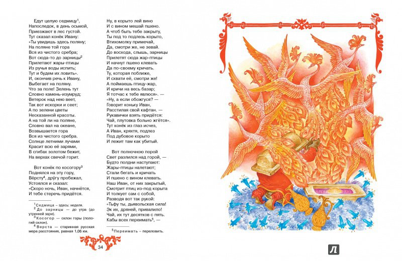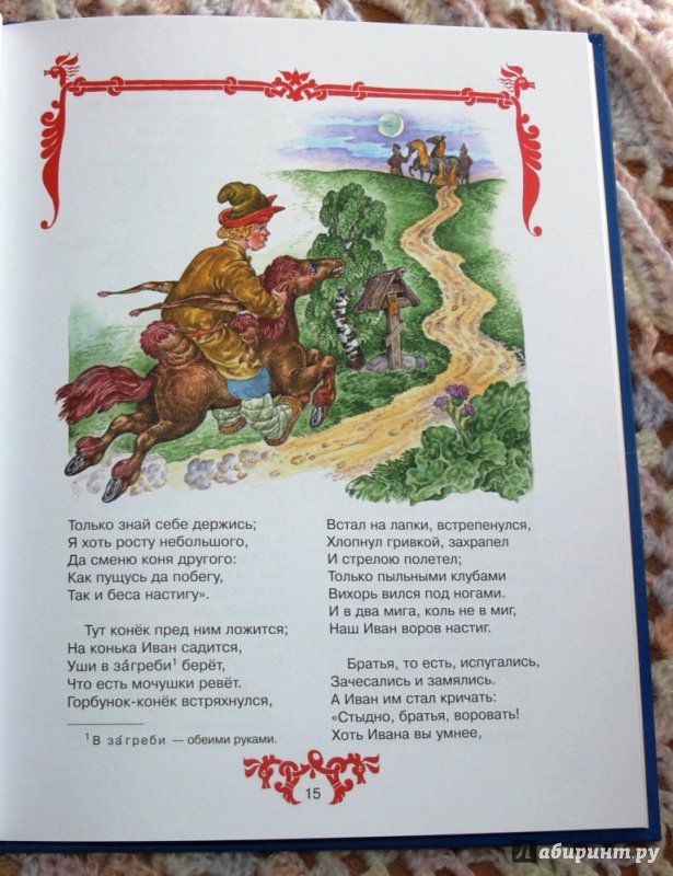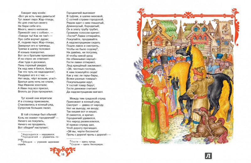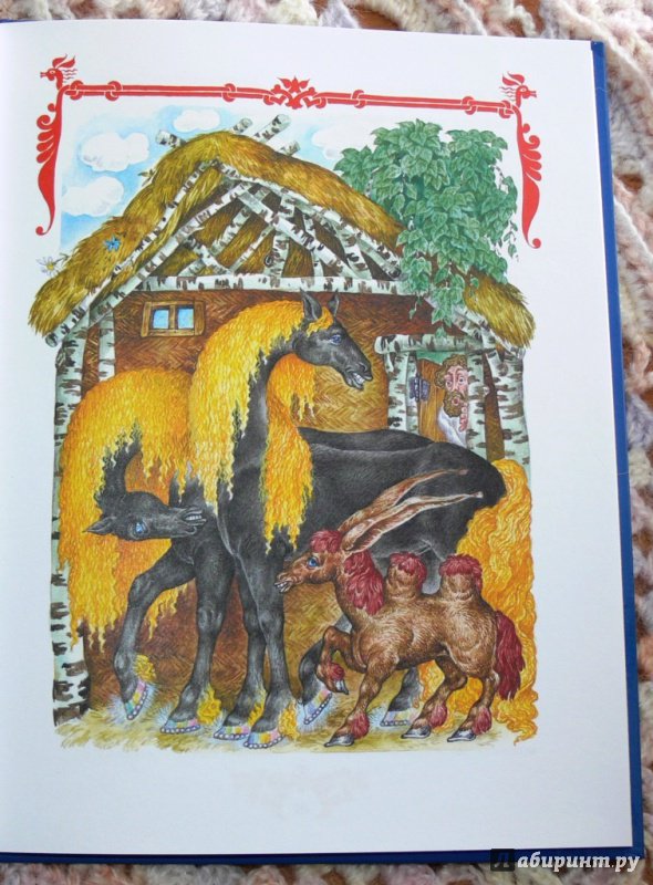 ОписаниеПопулярная детская сказка "Конек-Горбунок", написанная писателем П. П. Ершовым, представляет собой очень яркую и красивую стихотворную поэму. Сказка насыщена волшебными героями: Жар-птица, огромная рыба и другие. Стиль этой чудесной сказки - иронично-сатирический, она высмеивает тех, кто богат или мечтает разбогатеть, за чужой счет. Их страсти и желания настолько велики, что в итоге отрицательные герои остаются ни с чем. А вот Иван, который был честным и щедрым, не надеясь ни на какие похвалы и тем более на вознаграждение, без лукавства и притворства был всегда готов ради счастья другого человека пожертвовать своею жизнью. Именно поэтому у него появляется такой мудрый друг, как волшебный Конек-Горбунок.Популярная детская сказка "Конек-Горбунок", написанная писателем П. П. Ершовым, представляет собой очень яркую и красивую стихотворную поэму. Сказка насыщена волшебными героями: Жар-птица, огромная рыба и другие. Стиль этой чудесной сказки - иронично-сатирический, она высмеивает тех, кто богат или мечтает разбогатеть, за чужой счет. Их страсти и желания настолько велики, что в итоге отрицательные герои остаются ни с чем. А вот Иван, который был честным и щедрым, не надеясь ни на какие похвалы и тем более на вознаграждение, без лукавства и притворства был всегда готов ради счастья другого человека пожертвовать своею жизнью. Именно поэтому у него появляется такой мудрый друг, как волшебный Конек-Горбунок.