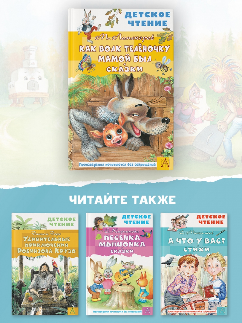 В сборнике собраны сказки талантливого писателя, сценариста и драматурга Михаила Фёдоровича Липскерова. Его самые известные произведения, которые легли в основу знаменитых мультфильмов – «Как волк Телёночку мамой был», «Живая игрушка», «Заяц, который любил давать советы» и «Уважаемый леший» – и вошли в эту книгу.