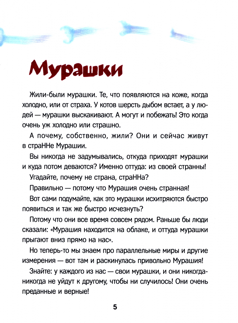 ОписаниеНе нужно стесняться веснушек!Они украшают только хороших и добрых людей.А трудолюбивые и отважные мурашки охраняют наш сон от кошмариков и Ночной Хрумбы и не дают нам замерзнуть, сражаясь с армией генерала Холодца.Спешите в страну Мурашию, где и обитают эти чудесные создания и их непримиримые, но очень смешные противники!Не нужно стесняться веснушек!Они украшают только хороших и добрых людей.А трудолюбивые и отважные мурашки охраняют наш сон от кошмариков и Ночной Хрумбы и не дают нам замерзнуть, сражаясь с армией генерала Холодца.Спешите в страну Мурашию, где и обитают эти чудесные создания и их непримиримые, но очень смешные противники!