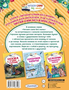 В книжках серии «Читаем сами без мамы» ты встретишься с самыми знаменитыми героями лучших детских авторов. Большие буквы и слова с ударениями помогут тебе с лёгкостью прочитать всю книжку от начала и до конца. Их можно взять с собой в дорогу, на прогулку, читать вместе с друзьями!