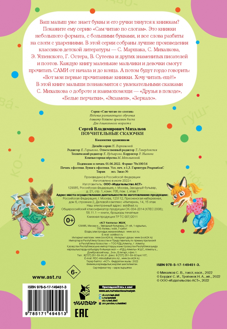СвернутьВаш малыш уже знает буквы и его ручки тянутся к книжкам?Покажите ему серию "Сам читаю по слогам". Это книжки небольшого формата, с большими буквами, и все слова разбиты на слоги с ударениями. В этой серии собраны лучшие произведения классиков детской литературы - С. Маршака, С. Михалкова, Э. Успенского, Г. Остера, В. Сутеева и других знаменитых писателей и поэтов. Каждую книгу маленькие мальчики и девочки смогут прочитать САМИ от начала и до конца. А потом будут гордо говорить: "Вот мои первые прочитанные книжки. Хочу читать ещё!".В этой книге малыши познакомятся с увлекательными сказками о доброте и взаимопомощи С. МихалковаДля дошкольного возраста.Крупный шрифт, разбивка на слоги, ударения, запоминающиеся цветные иллюстрации - в книгах серии "Сам читаю по слогам" есть всё необходимое для формирования у ребенка прочного навыка чтения и стимулирования устойчивого интеререса к книге.