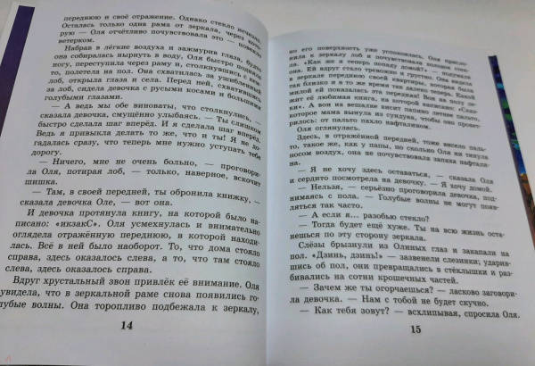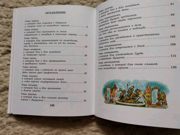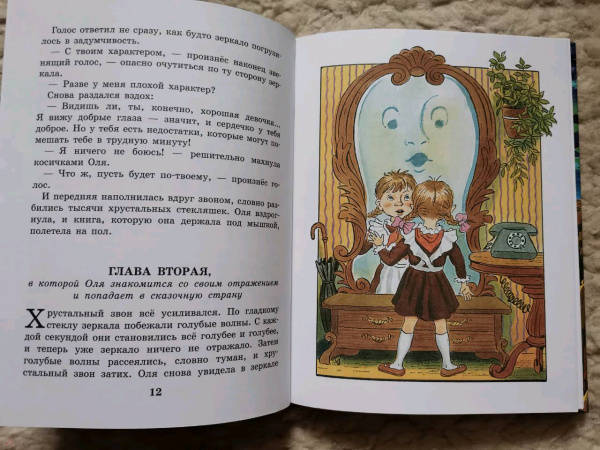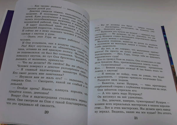 ОписаниеОднажды школьница Оля с помощью волшебного зеркала попадает в Королевство кривых зеркал. В этом необычном королевстве всё перевёрнуто с ног на голову: настоящих тружеников здесь считают лентяями, глупцов - мудрецами, крошку хлеба - целой булкой. Оле вместе со своим отражением, девочкой по имени Яло, предстоит спасти зеркальщика Гурда от казни и победить зло, царившее в Королевстве кривых зеркал много лет. Но до этого Оле придётся взглянуть на себя со стороны и встретиться со своими недостатками. Для среднего школьного возраста.Однажды школьница Оля с помощью волшебного зеркала попадает в Королевство кривых зеркал. В этом необычном королевстве всё перевёрнуто с ног на голову: настоящих тружеников здесь считают лентяями, глупцов - мудрецами, крошку хлеба - целой булкой. Оле вместе со своим отражением, девочкой по имени Яло, предстоит спасти зеркальщика Гурда от казни и победить зло, царившее в Королевстве кривых зеркал много лет. Но до этого Оле придётся взглянуть на себя со стороны и встретиться со своими недостатками. Для среднего школьного возраста.