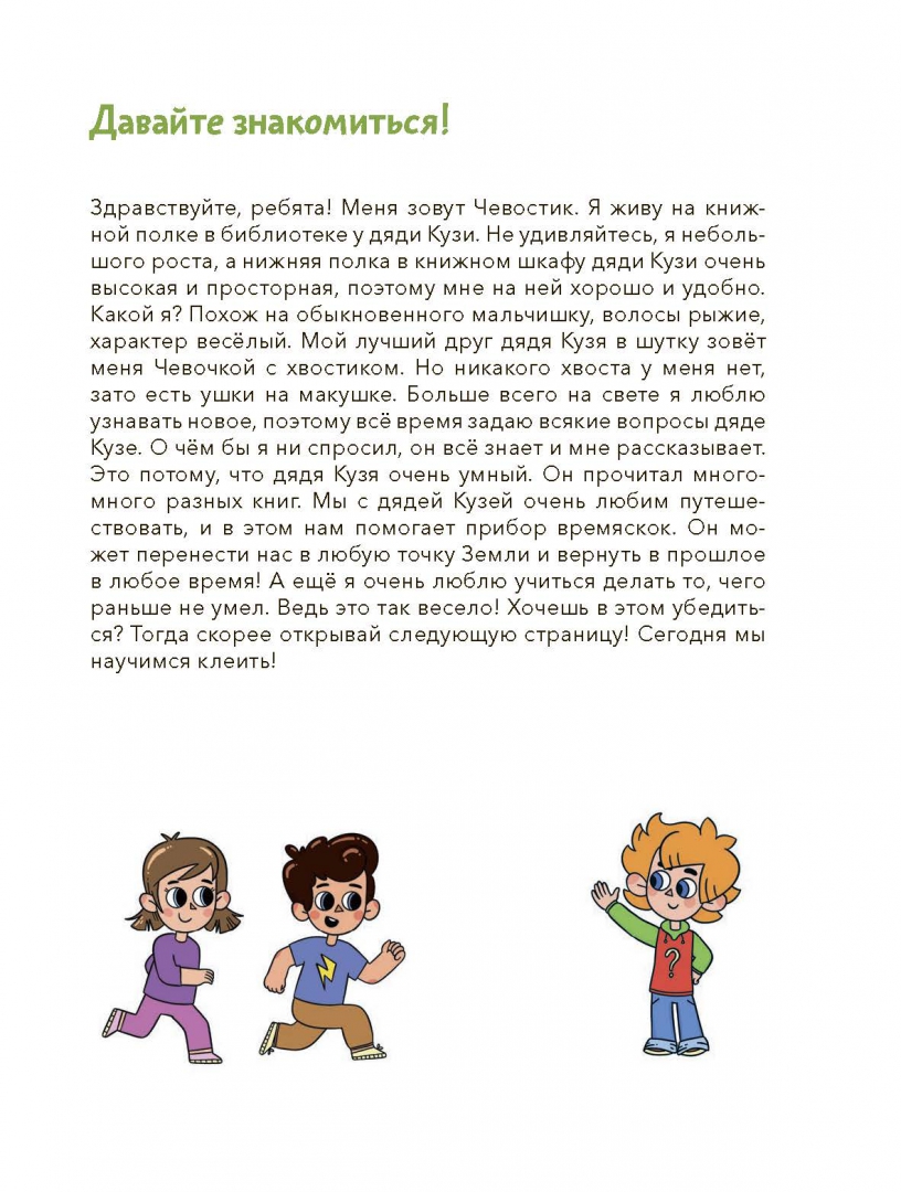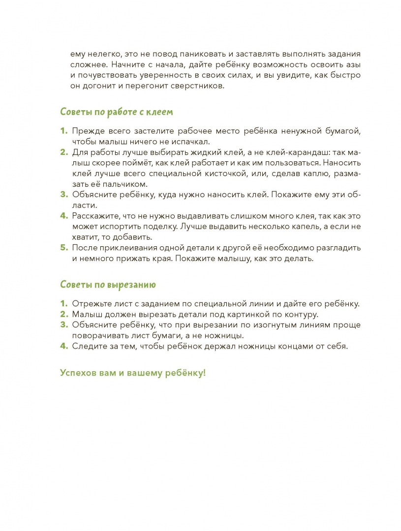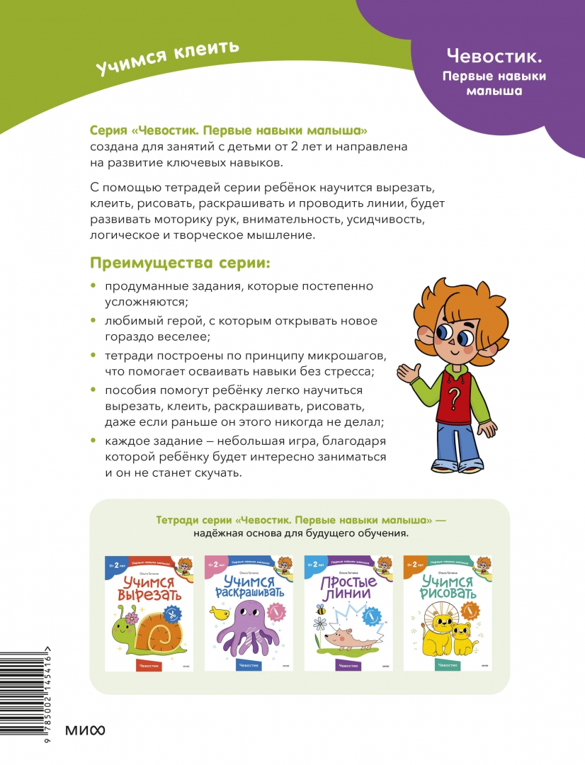ОписаниеНовая серия развивающих тетрадей для самых маленьких с любимым героем Чевостиком.Благодаря тетради «Учимся клеить» ребёнок научится аккуратно приклеивать на страницу фигуры разной формы на отмеченную область, склеивать картинки, точно совмещая линии, и делать простые аппликации. Для работы с тетрадью необходимо уметь вырезать, но если ваш малыш пока не освоил этот навык, вы можете помогать ему вырезать детали.Фишки серии— Продуманные задания, которые постепенно усложняются.— Любимый герой, с которым открывать новое гораздо веселее.— Тетради построены по принципу микрошагов, что помогает осваивать навыки без стресса.— Пособия помогут ребёнку легко научиться вырезать, клеить, раскрашивать, рисовать, даже если раньше он этого никогда не делал.— Каждое задание — небольшая игра, благодаря которой ребёнку будет интересно заниматься и он не станет скучать.Как пользоваться тетрадью— Прочитайте ребёнку, кто такой Чевостик. Вместе внимательно рассмотрите его, а затем переходите к заданиям.— Не оставляйте малыша одного во время занятий, иначе не будет ожидаемого результата. Ребёнок потеряет интерес, и вернуть его к занятиям будет значительно труднее.— Рекомендуем заранее определить, сколько заданий будет выполнять ребёнок (например, один или два листа). Полезно переключить внимание малыша на что-то другое, когда он ещё хочет позаниматься с тетрадью. В таком случае ребёнок с радостью согласится продолжить занятия на следующий день и будет ждать этого.— Старайтесь заниматься в хорошем настроении и превращать учебный процесс в игру. Тогда ребёнок полюбит учиться и будет испытывать с этим меньше сложностей в будущем.— Если ребёнок сделает что-то неправильно, не ругайте его и не заставляйте переделывать. Найдите, за что ребёнка можно похвалить (например: «Я вижу, как ты старался!»), а после этого укажите на недочёты и покажите своим примером, как нужно делать правильно.— Если ребёнок не понимает, что он должен сделать, помогите ему: начните выполнять задание самостоятельно, а затем попросите ребёнка продолжить.— Помните, что у каждого человека свой путь развития. Если ваш малыш старше заявленного на тетради возраста, но какой-то навык даётся ему нелегко, это не повод паниковать и заставлять выполнять задания сложнее. Начните с начала, дайте ребёнку возможность освоить азы и почувствовать уверенность в своих силах, и вы увидите, как быстро он догонит и перегонит сверстников.О серииСерия тетрадей «Чевостик. Первые навыки малыша» создана для занятий с детьми от 2 лет и направлена на развитие ключевых навыков, без которых ребёнок не сможет обойтись в дальнейшем обучении.С помощью тетрадей серии ребёнок научится вырезать, клеить, рисовать, раскрашивать, проходить лабиринты и проводить линии, будет развивать моторику рук, внимательность, усидчивость, логическое и творческое мышление.Каждое задание тетради — это маленькая игра. Все упражнения усложняются постепенно и объединены общим сюжетом, что добавляет ребенку интереса к занятиям. На каждой странице с Чевостиком что-то происходит, малышу хочется узнать, что будет дальше, и он вовлекается в процесс обучения.Для кого эта книгаДля детей от 2 лет.Для родителей, которые хотят плавно и бережно развивать важные навыки у малыша.СвернутьНовая серия развивающих тетрадей для