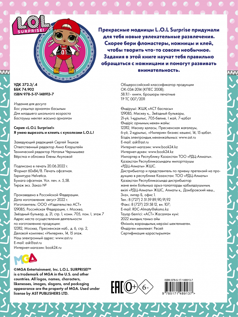 Прекрасные модницы L.O.L. Surprise придумали для тебя новые увлекательные развлечения. Скорее бери фломастеры, ножницы и клей, чтобы творить что-то совсем необычное. Задания в этой книге научат тебя правильно обращаться с ножницами и помогут развивать внимательность.Для младшего школьного возраста.Красотка приглашена на вечеринку. Какого аксессуара ей не хватает? Давай вырежем и приклеим красивый бантик! В книжке есть всё необходимое, чтобы завершить наряд. Ребёнок справится и сам, но ещё безопаснее и интереснее, если помогает родитель. Тогда куколка точно получится красивой, а сам наряд — ровным и модным! -