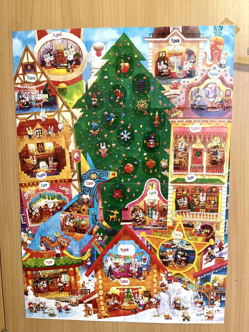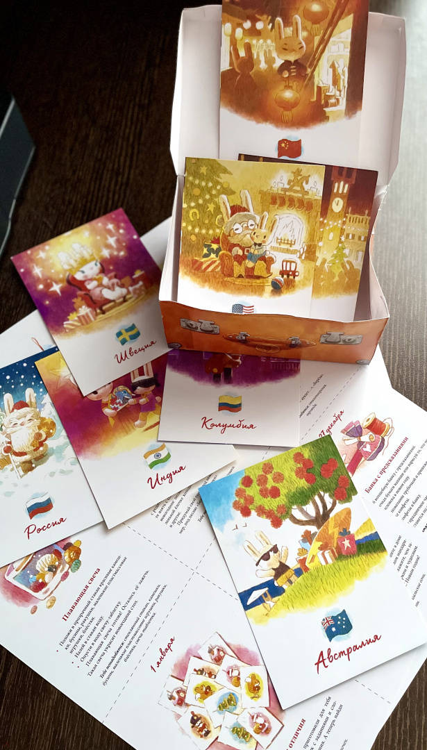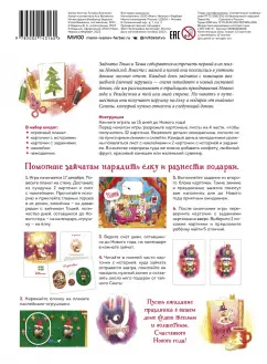 ОписаниеЧтобы ожидание Нового года не было грустным и утомительным, проведите 15 дней уходящего года вместе с увлекательным и уютным адвентом.Семья зайчиков решила встретить Новый год в домике лесного отеля, куда съехались их друзья из разных стран. Зайчатам Тоше и Таше выпало быть почтальонами тайного Санты. Каждый день они оказываются в новом домике иностранного гостя, дарят ему подарок и слушают историю о том, как встречают Новый год или Рождество в его стране.Состав адвента:огромный плакат, который украсит стену в комнате;15 листов с наклейками;16 карточек с историей;16 карточек с заданиями;чемоданчик, в который каждый день надо класть по две карточки, лист с наклейками и маленький сувенир по желанию;игра "Найди отличия".Инструкция:Начните играть за 15 дней до Нового года!Перед началом игры разрежьте картонные листы на четыре части, чтобы получилось 32 карточки. Вырежьте детали чемоданчика, согните их по пунктирным линиям и склейте. Каждый день в чемоданчике должны появляться лист с наклейками и две карточки: с историей и с заданием. В качестве сюрприза туда же можно добавить конфету, любимый фрукт, красивый камешек или маленький сувенир.Помогите зайчатам нарядить ёлку и разнести подарки.Игра начинается 17 декабря. Повесьте плакат на стену. Достаньте из чемоданчика две карточки и лист с наклейками. Прочитайте историю и приклейте главных героев в их домик, оленёнка — на диван рядом с зайчиком Тошей, количество дней, оставшихся до Нового года, — на календарь, игрушку — на ёлку.Наряжайте ёлочку на плакате наклейками-игрушками.Ведите счёт дням, оставшимся до Нового года, на календаре в комнате зайчат.Читайте в нижней части карточки с историей, куда зайчата отправится завтра, и помогайте им находить нужный домик и оставлять около него подарок от Тайного Санты.Выполняйте задания из второго блока карточек. Такие зимние и праздничные занятия помогут вам наполнить дни до Нового года приятным ожиданием.После окончания игры переверните карточки с заданиями картинками вверх. Выберите две похожие картинки и предложите ребёнку найти пять отличий.Для кого этот адвент-календарь:Для детей от 4 лет и их родителей.СвернутьЧтобы ожидание Нового года не было грустным и утомительным, проведите 15 дней уходящего года вместе с увлекательным и уютным адвентом.Семья зайчиков решила встретить Новый год в домике лесного отеля, куда съехались их друзья из разных стран. Зайчатам Тоше и Таше выпало быть почтальонами тайного Санты. Каждый день они оказываются в новом домике иностранного гостя, дарят ему подарок и слушают историю о том, как встречают Новый год или Рождество в его стране.Состав адвента:огромный плакат, который украсит стену в комнате;15 листов с наклейками;16 карточек с историей;16 карточек с заданиями;чемоданчик, в который каждый день надо класть по две карточки, лист с наклейками и маленький сувенир по желанию;игра "Найди отличия".Инструкция:Начните играть за 15 дней до Нового года!Перед началом игры разрежьте картонные листы на четыре части, чтобы получилось 32 карточки. Вырежьте детали чемоданчика, согните их по пунктирным линиям и склейте. Каждый день в чемоданчике должны появляться лист с наклейками и две карточки: с историей и с заданием. В качестве сюрприза туда же можно добавить конфету, любимый фрукт, красивый камешек или маленький с