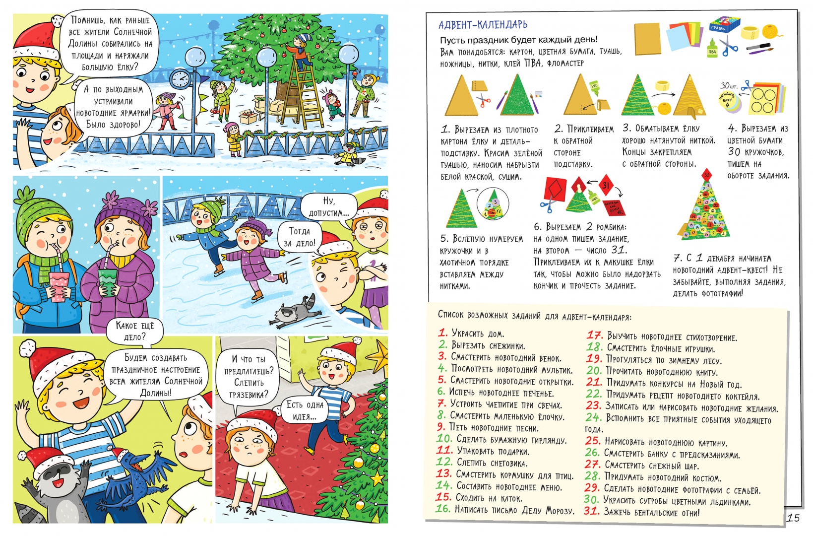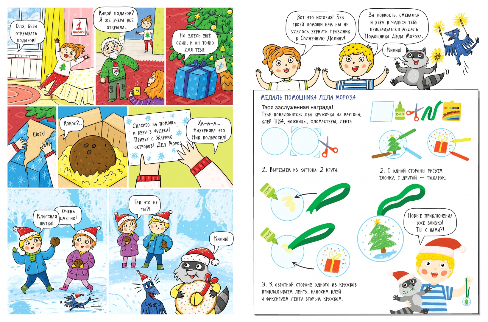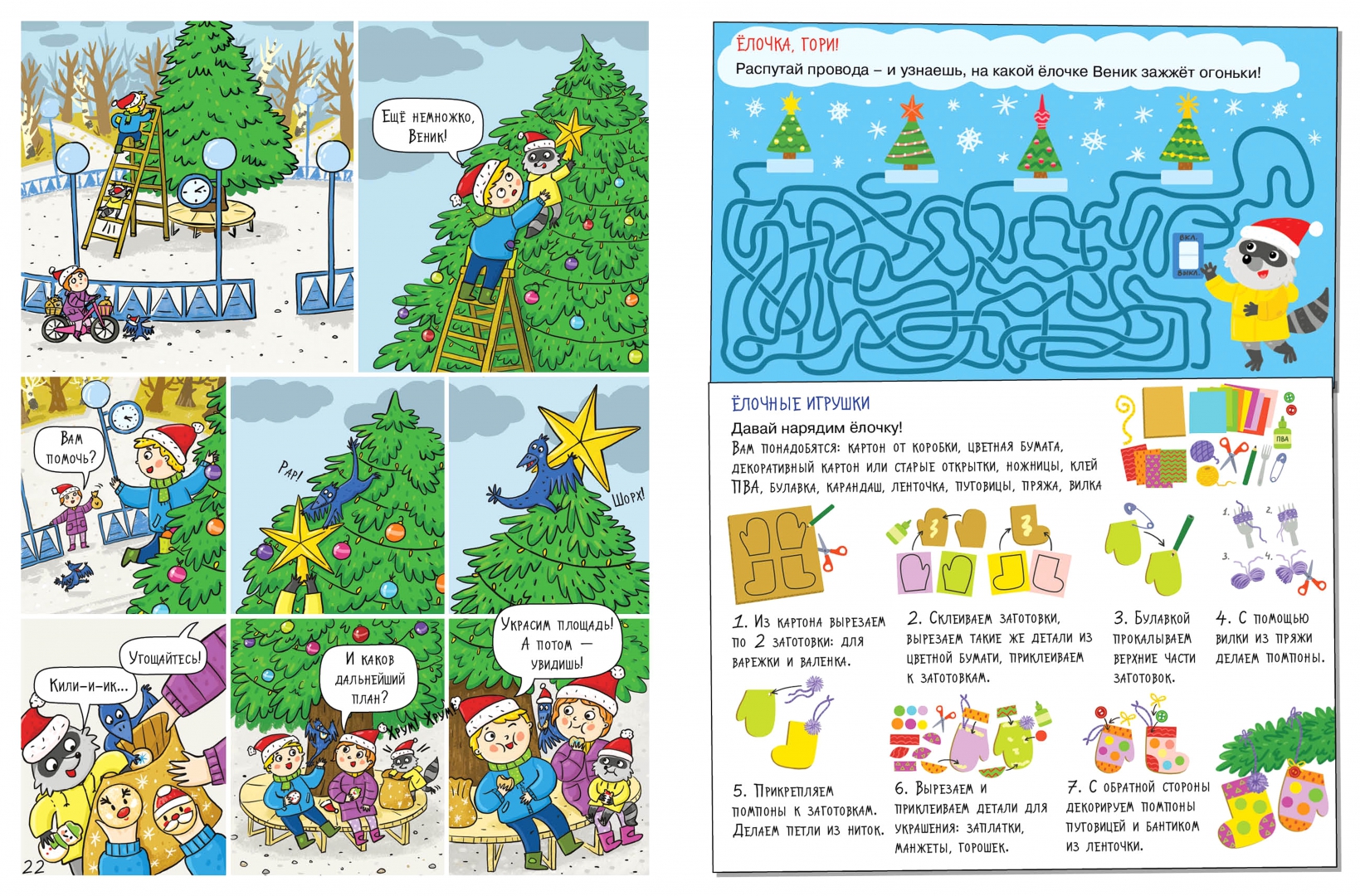 ОписаниеНовая книга про волшебное путешествие мальчика Николаса и его ручного енота Веника в канун любимых зимних праздников. Поэтому мы сделали ее особенно праздничной, в нарядном переплете, с бонусами и сюрпризами для читателей. Это специальный новогодний подарочный выпуск, в котором еще больше тайн и приключений. Ведь так важно, чтобы самый волшебный праздник оставался с нами и в наших воспоминаниях как самое увлекательно приключение в году! Внутри: игры-бродилки, комиксы, лабиринты, праздничные поделки, гляделки и находилки, задачки и головоломки, истории по картинкам и загадочные совпадения. Все задания в книге выполняются устно, так что она не будет использована сразу, а сможет радовать долго. Книга выходит в серии "Суперквест для ума". Она понятна, интересна и полезна современным детям. Огромное количество разнообразных приемов на развитие внимания, памяти, мышления, зрительно-моторной координации, воображения стимулирует развитие гибких навыков. Абсолютно новый вид нон-фикш для детей поколения Z.Для занятий взрослых с детьми дошкольного возраста.СвернутьНовая книга про волшебное путешествие мальчика Николаса и его ручного енота Веника в канун любимых зимних праздников. Поэтому мы сделали ее особенно праздничной, в нарядном переплете, с бонусами и сюрпризами для читателей. Это специальный новогодний подарочный выпуск, в котором еще больше тайн и приключений. Ведь так важно, чтобы самый волшебный праздник оставался с нами и в наших воспоминаниях как самое увлекательно приключение в году! Внутри: игры-бродилки, комиксы, лабиринты, праздничные поделки, гляделки и находилки, задачки и головоломки, истории по картинкам и загадочные совпадения. Все задания в книге выполняются устно, так что она не будет использована сразу, а сможет радовать долго. Книга выходит в серии "Суперквест для ума". Она понятна, интересна и полезна современным детям. Огромное количество разнообразных приемов на развитие внимания, памяти, мышления, зрительно-моторной координации, воображения стимулирует развитие гибких навыков. Абсолютно новый вид нон-фикш для детей поколения Z.Для занятий взрослых с детьми дошкольного возраста.СвернутьСвернуть