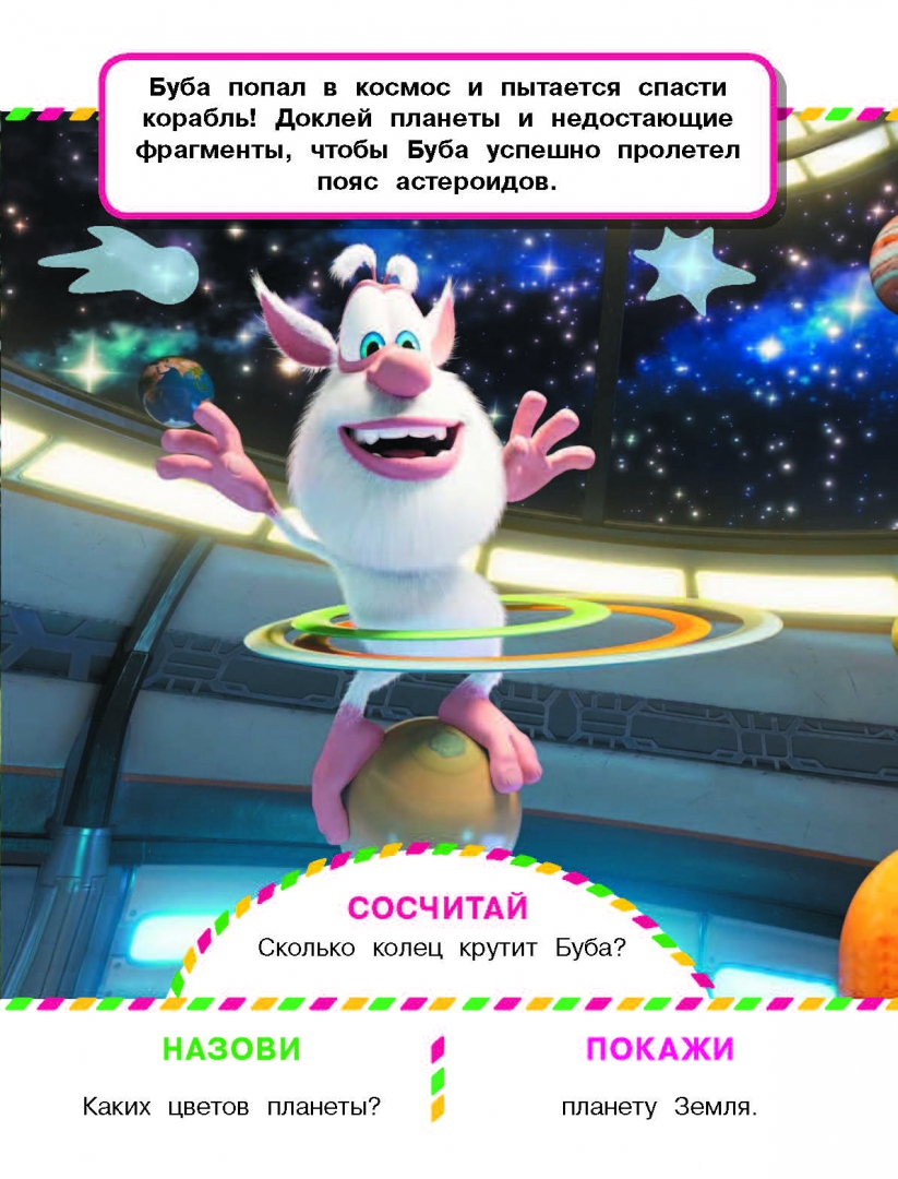 ОписаниеБуба и его друзья постоянно оказываются в разных местаю и придумывают весёлые занятия. Играй с любимыми героями: поймай с Бубой бабочек, спаси космический корабль, создай уникальный бутерброд и многое другое. Если вдруг сделаешь задание неправильно — не переживай, ведь наклейки многоразовые, и ты можешь клеить их не только в книгу!Буба и его друзья постоянно оказываются в разных местаю и придумывают весёлые занятия. Играй с любимыми героями: поймай с Бубой бабочек, спаси космический корабль, создай уникальный бутерброд и многое другое. Если вдруг сделаешь задание неправильно — не переживай, ведь наклейки многоразовые, и ты можешь клеить их не только в книгу!
